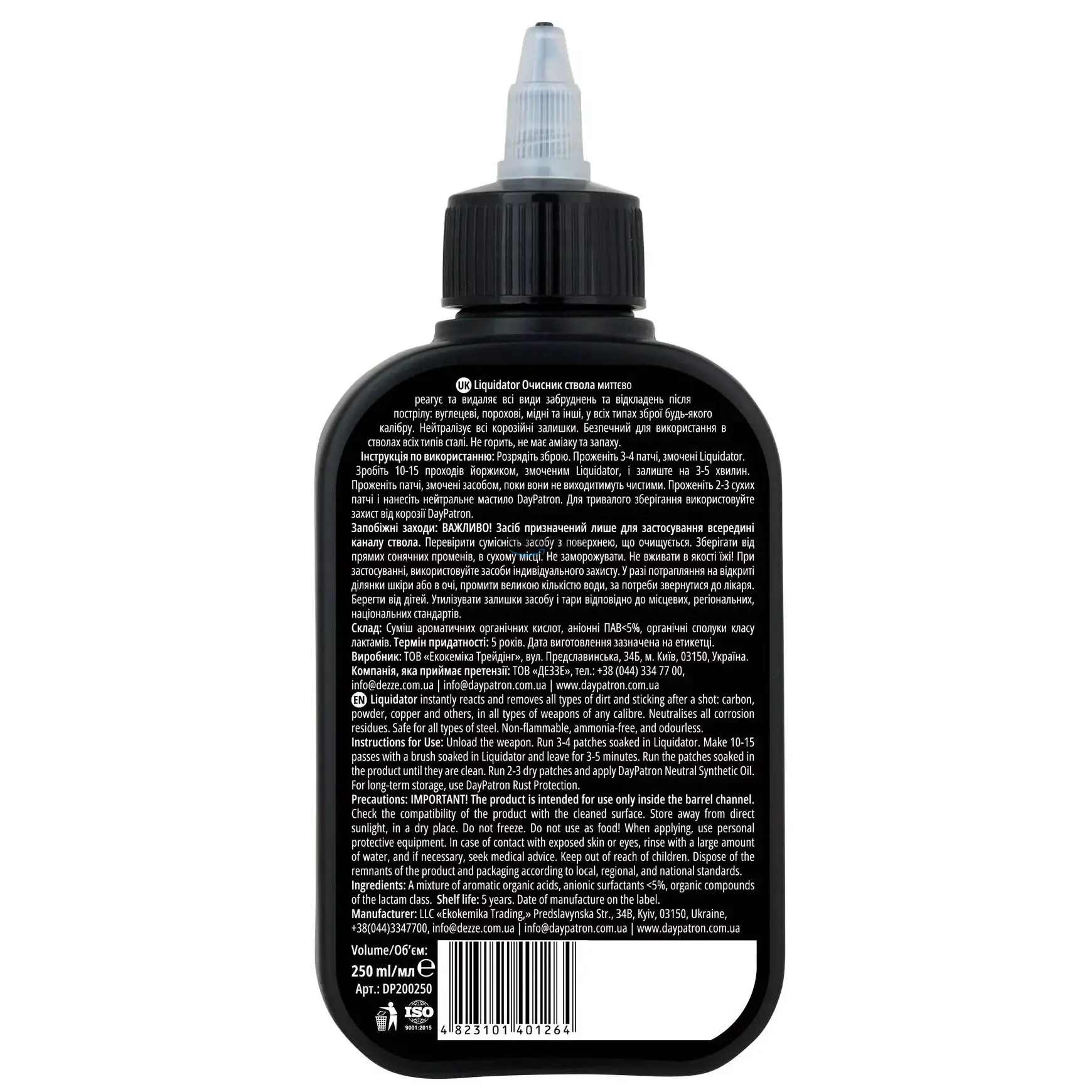 Засіб для чищення (очисник ствола) DAY PATRON Liquidator/Ліквідатор - потужний, високопродуктивний засіб, який миттєво вступає в реакцію і видаляє всі види забруднень та відкладень після пострілу: вуглецеві, порохові, мідні, свинцеві та інші залишки, у всіх видах нарізної та гладкоствольної зброї малого та великого калібру. Ефективно нейтралізує всі корозійні залишки, короткостроково запобігаючи появі корозії.