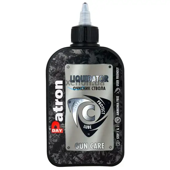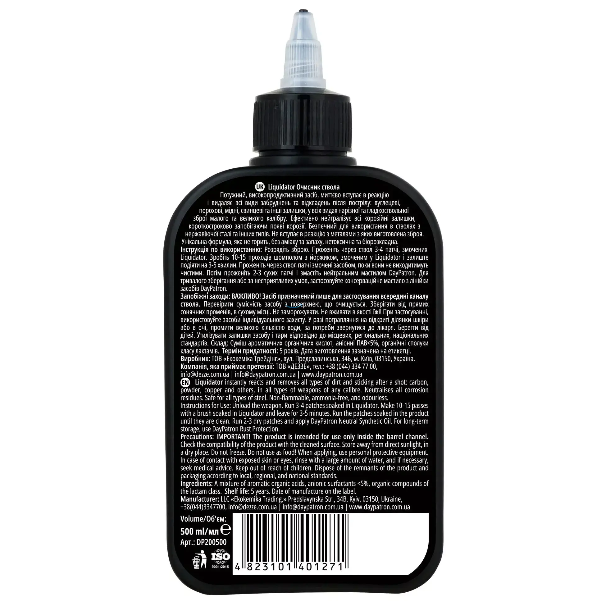 Засіб для чищення (очисник ствола) DAY PATRON Liquidator/Ліквідатор - потужний, високопродуктивний засіб, який миттєво вступає в реакцію і видаляє всі види забруднень та відкладень після пострілу: вуглецеві, порохові, мідні, свинцеві та інші залишки, у всіх видах нарізної та гладкоствольної зброї малого та великого калібру. Ефективно нейтралізує всі корозійні залишки, короткостроково запобігаючи появі корозії.
