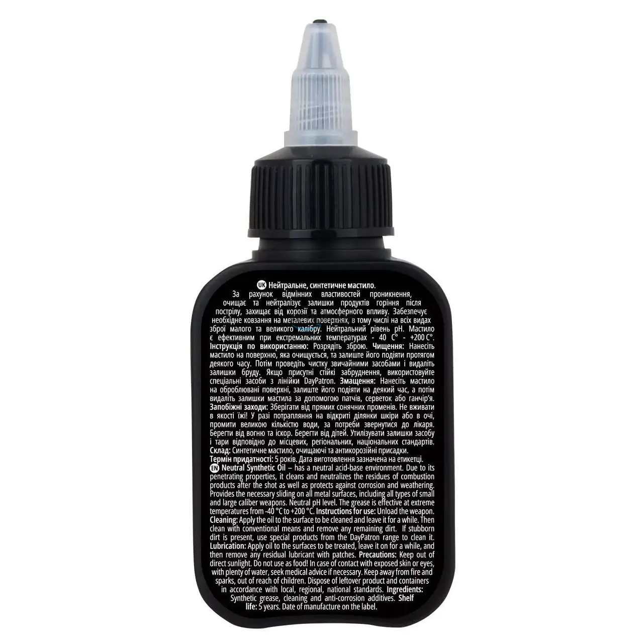 Нейтральне синтетичне мастило 100 мл DAY PATRON Synthetic Neutral Oil має нейтральне кислотно-лужне середовище. За рахунок відмінних властивостей проникнення, очищує та нейтралізує залишки продуктів горіння після пострілу, захищає від корозії та атмосферного впливу, забезпечує необхідне ковзання на всіх рухомих і не рухомих металевих поверхнях, всіх видах нарізної та гладкоствольної зброї малого та великого калібру. Забезпечує ефективну роботу механізмів при екстремальних температурах - 40С° до +200С°.