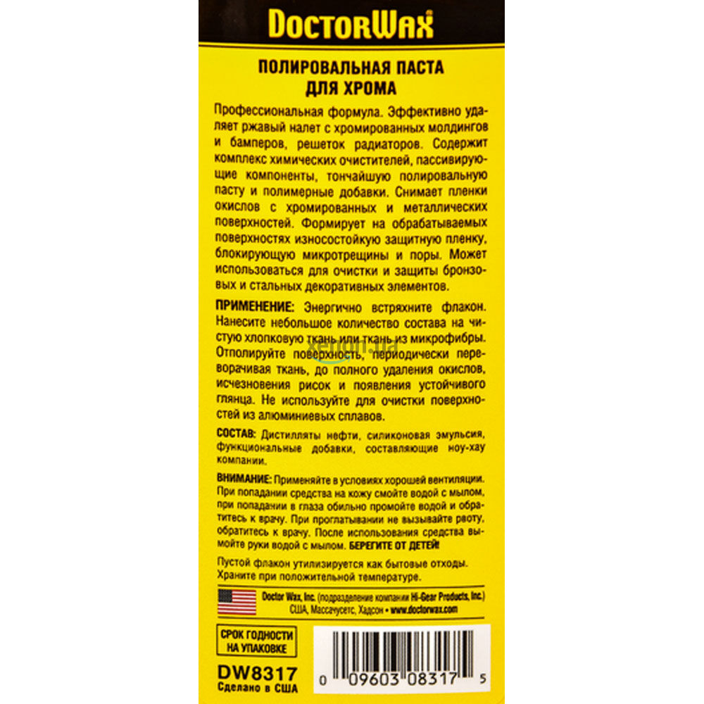 Високотехнологічний склад. На відміну від багатьох представлених на ринку, полірувальна паста для хрому Doctor Wax Chrome Polish & Protector містить комплекс хімічних очисників, компоненти, що пасивують, найтоншу полірувальну пасту і полімерні добавки. Без зусиль знімає плівки оксидів із хромованих, металевих поверхонь та пластикових деталей, покритих хромом.