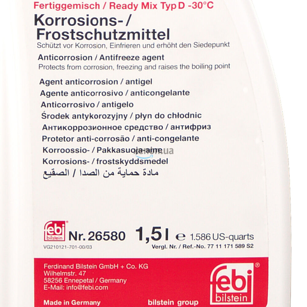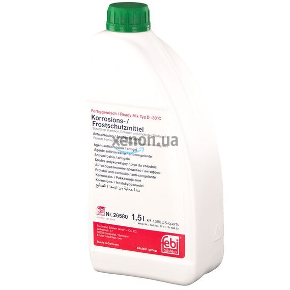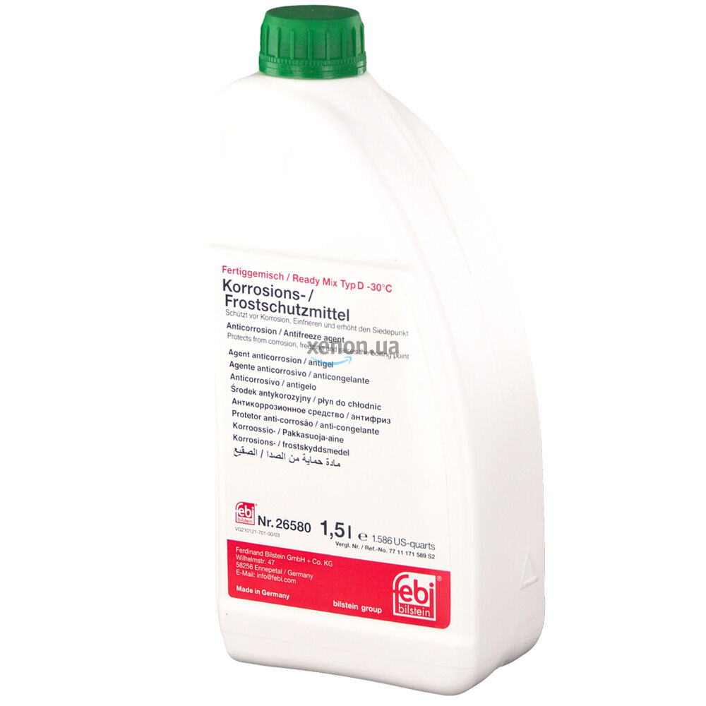 Зелений преміальний готовий антифриз Febi G11 26580 -30°C Renault / Dacia об'ємом 1,5 літри. В двигунах внутрішнього згорання значна частина енергії, яку отримують при згоранні палива, перетворюється в тепло. Щоб запобігти перегріву двигуна і, в подальшому, вихід його механічних компонентів з ладу, система охолодження двигуна повинна ефективно розсіювати тепло в атмосферу. Частина тепла, яку відводить система охолодження, у випадку необхідності, використовується для нагріву повітря в салоні автомобіля.
