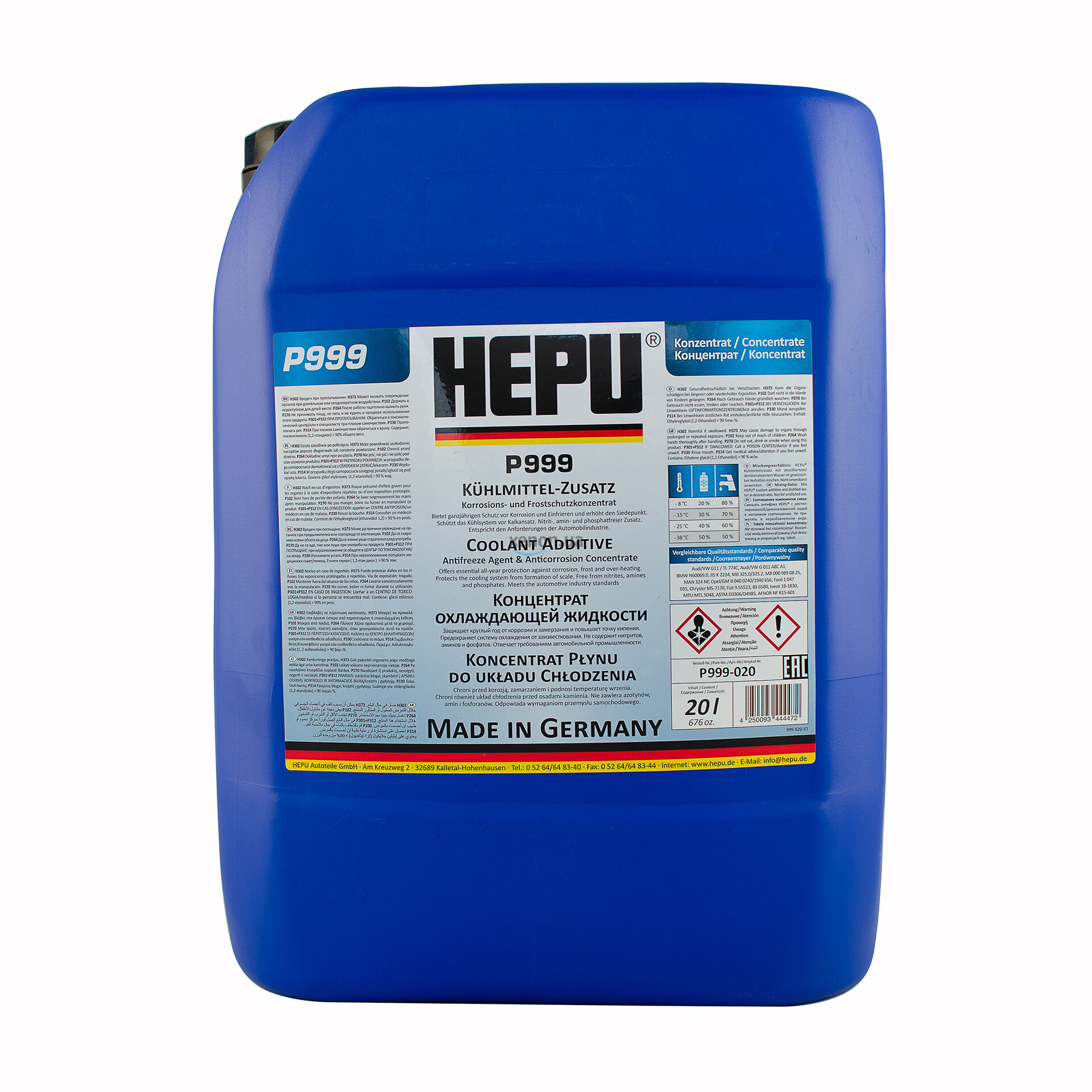Синій преміальний антифриз HEPU P999-020 (Німеччина) класу G11 з температурним режимом -38°C та об'ємом 20 літрів. Концентрат. Призначений для змішування з дистильованою водою. Концентрована охолоджуюча рідина універсального застосування. Захищає від замерзання, перегріву, корозії та утворення вапняного нальоту. Призначений для алюмінієвих і чавунних двигунів. Не містить нітритів, амінів та фосфатів.