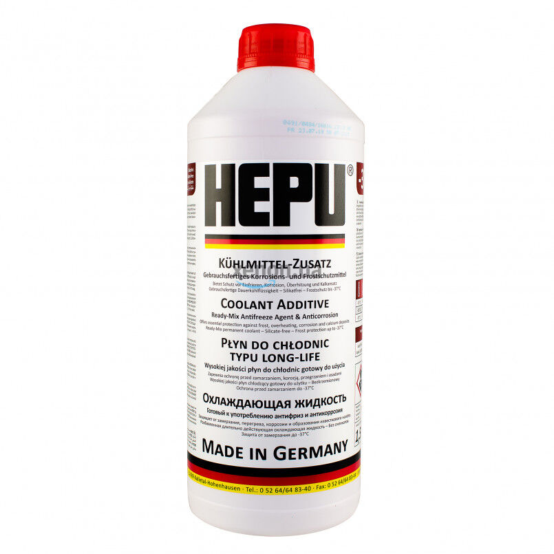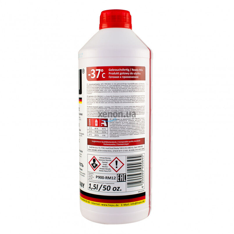 Червоний антифриз HEPU P900-RM12 (Німеччина) класу G12 з температурним режимом до -37°C та об'ємом 1,5 літрів. Готовий антифриз. Аналог концентрату, змішаного 1:1 з дистильованою водою, призначений для використання одразу, (змішувати з дистильованою водою не потрібно). Готова охолоджуюча рідина універсального застосування. Захищає від замерзання, перегріву, корозії та утворення вапняного нальоту. Призначений для алюмінієвих і чавунних двигунів. Не містить нітритів, амінів та фосфатів.