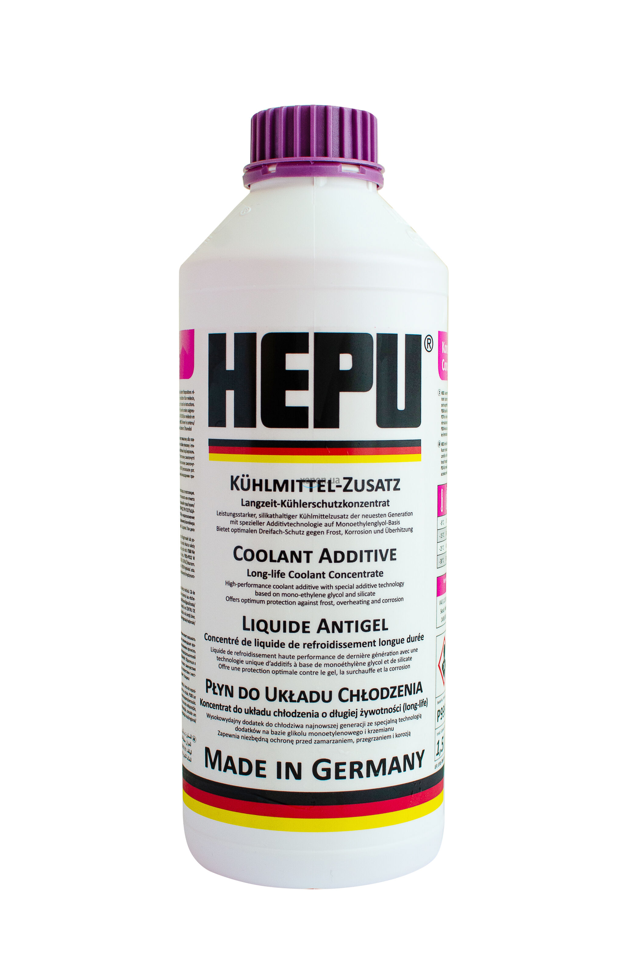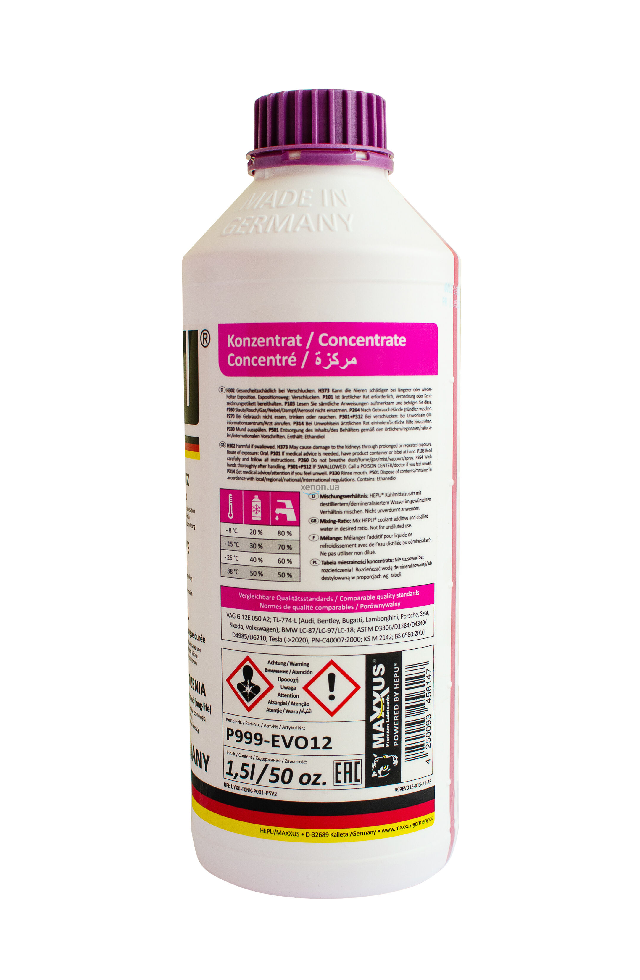 HEPU EVO G12 - фіолетовий концентрат антифризу HEPU (Німеччина) класу G12 з температурним режимом -38°C та об'ємом 1,5 літри. Концентрат. Призначений для змішування з дистильованою водою. Концентрована охолоджуюча рідина універсального застосування. Захищає від замерзання, перегріву, корозії та утворення вапняного нальоту. Призначений для алюмінієвих і чавунних двигунів. Не містить нітритів, амінів та фосфатів.