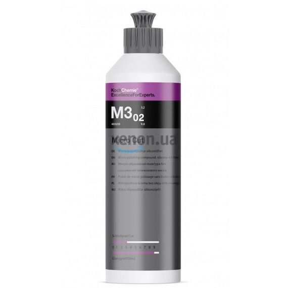 Політура для дзеркального блиску з усуненням ефекту „голограми“ Micro Cut M3.02 – машинний мікро-поліруючий склад останнього покоління , призначений для довготривалого усунення полірувальної "вуалі", "голограм", дрібних подряпин і аншліфів до розміру зернистості 3.000 на всіх лакофарбових системах (включаючи системи, стійкі до виникнення подряпин). Завдяки використанню високоспеціалізованих, супероднорідних абразивних матеріалів навіть на темних та подібних чутливих колірних тонах покриттів за екстремальних умов освітлення виходить блискучий та стійкий результат заключної обробки із дзеркальним блиском. Ефект „голограми“ та дрібні подряпини механічно усуваються, а не замазуються, як це часто буває.За рахунок цього може застосовуватися для полірування в один крок. Політура для дзеркального блиску з усуненням ефекту „голограми” Micro Cut M3.02 надзвичайно економічна, добре полірується і знімається без залишку. машини з примусовим обертанням (максимальна кількість обертів). Як альтернатива можлива обробка за допомогою ротаційної полірувальної машини. Перед використанням засохлі або нові губки слід просочити політурою. Вимкненою полірувальною машиною рівномірно нанести політуру на оброблювану поверхню, а потім легкими рухами розполірувати перехресним способом до тих пір, поки не утвориться прозора плівка, тобто поки не відбудеться повне розкладання оксиду алюмінію, що міститься. Кола, використані для нанесення цього продукту, не застосовують для нанесення інших продуктів. Для усунення залишків політури без нанесення подряпин та штрихів ми рекомендуємо використовувати нашу фірмову мікрофіброву серветку.