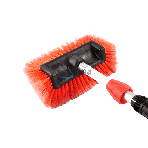 Телескопічна щітка для мийки з подачею води. Головка діаметром 25 см із щетиною із ПВХ дозволяє ефективно очищати кузов автомобіля. Рукоятка розсувається в діапазоні 1,2…2,4 м. Це дасть змогу вимити такі важкодоступні місця, як дах габаритного транспорту – автобусів, вантажівок тощо. До неї можна підключити подачу води, що значно підвищить ефективність щітки. Ця опція захищає від бризок води під час миття, її затікання в рукави. Вставки на рукоятці з термопластичної гуми (TPR) з антиковзким ефектом та виїмками для пальців покращують хват під час роботи.
