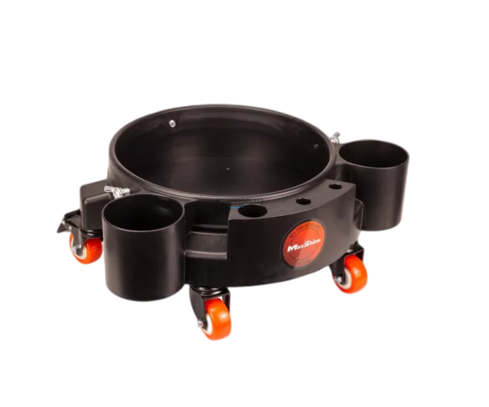 Візок на колесах з органайзером MaxShine Rolling Bucket Dolly – це підвищення зручності та покращення ергономіки зони мийки. Вона призначена для встановлення відра до 20 літрів. 3 стопорні гвинти допоможуть надійно зафіксувати відро. Прогумовані посилені колеса, що забезпечують обертання на 360°, оснащені гальмівною системою, яка за потреби може повністю знерухомити візок. В органайзері можна розмістити 2 пляшки або розпилювачі, пензлі, щітки.