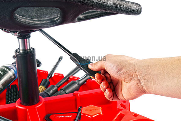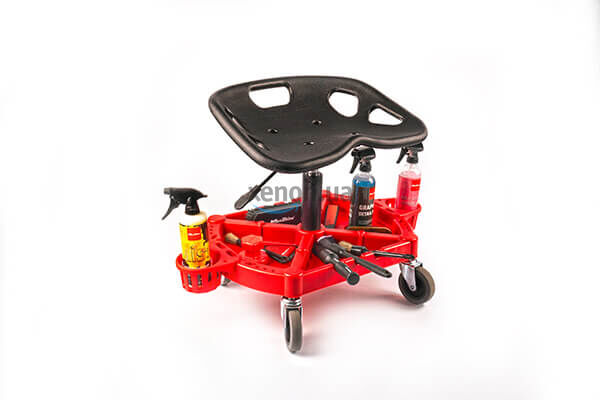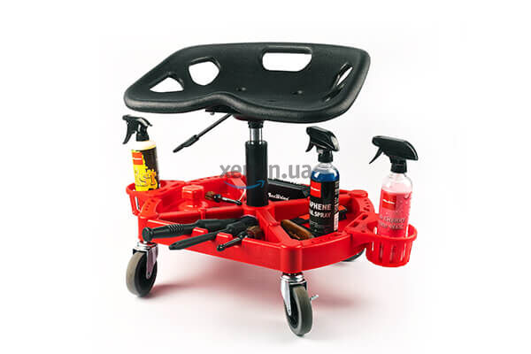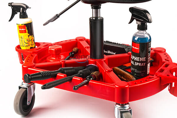 Підставка відіграє роль не тільки місця кріплення коліс та газліфту. Вона – зручний та практичний органайзер для розміщення інструментів та автохімії. На торцях – 2 великі тримачі для пляшок, розпилювачів, полірувальних паст. На двох інших бортах – функціональні вирізи для фіксації пензлів чи щіток у горизонтальному положенні.