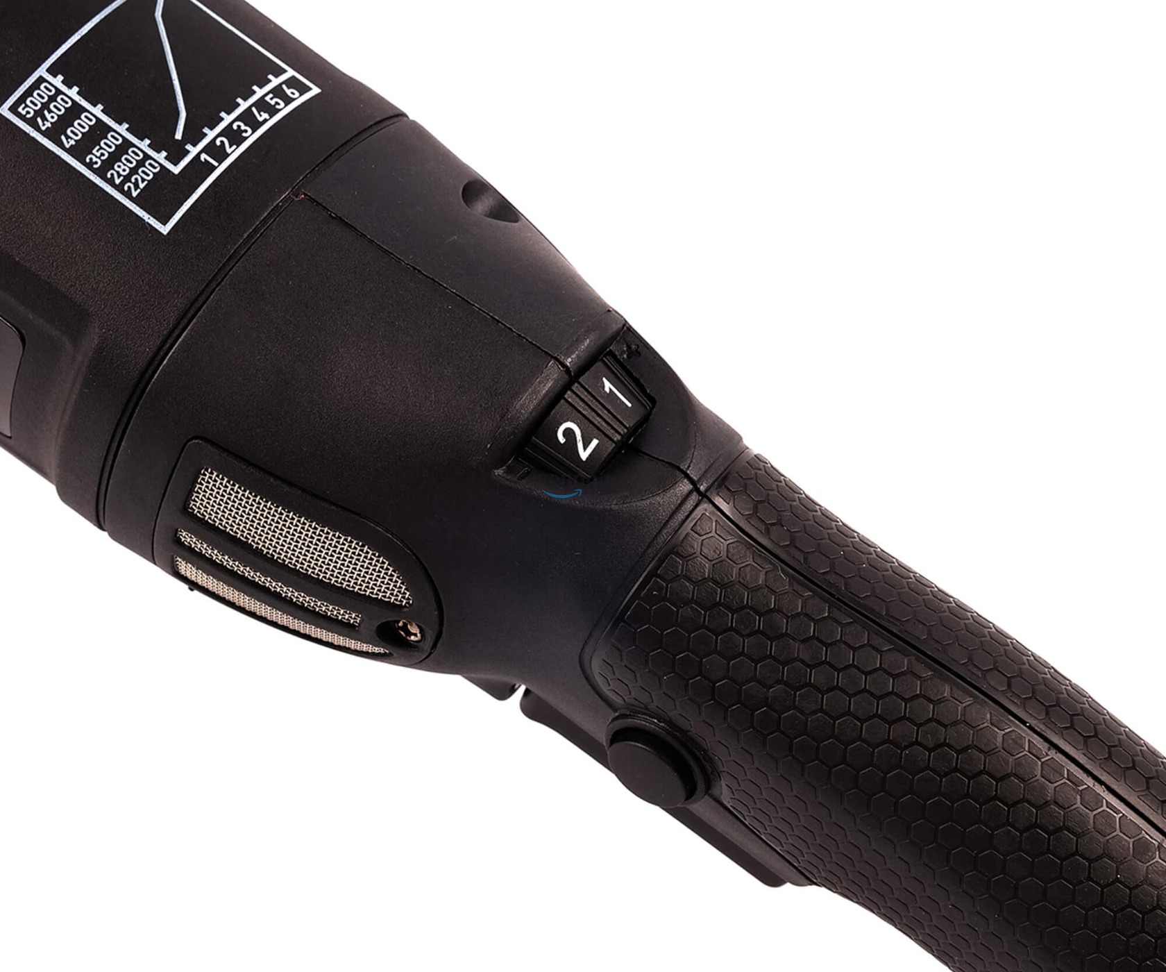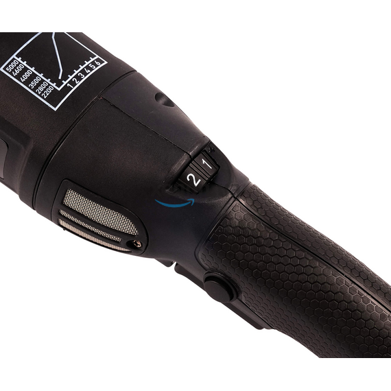 У машинки – електродвигун потужністю 1000 Вт з системою м'якого старту та 6-ти швидкісний перемикач обертів у діапазоні 2500…6000 об/хв. Це дозволяє вибрати режим роботи, виходячи з поточних завдань. Курок контролю обертів оснащений блокатором ходу.