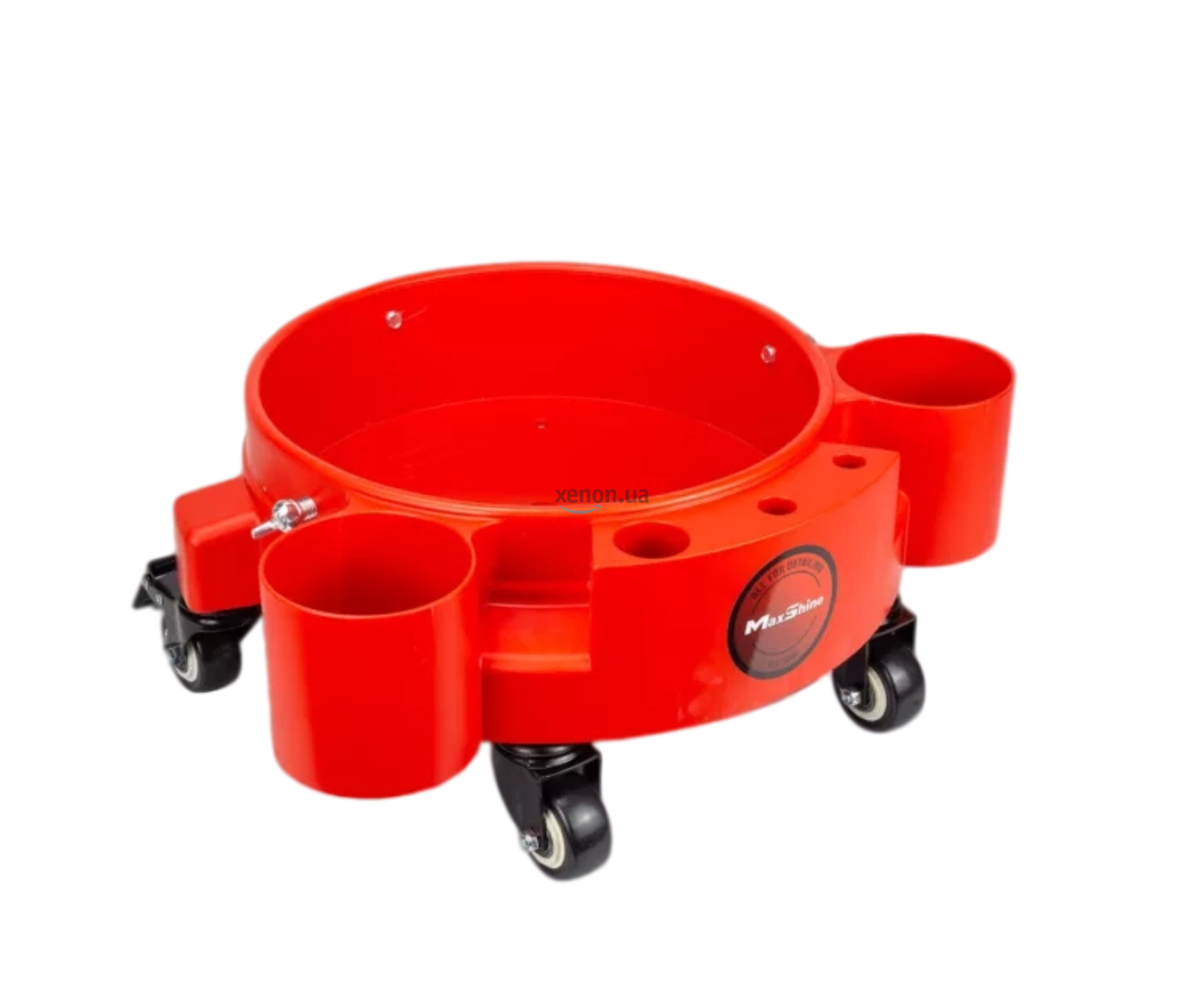 Візок на колесах з органайзером MaxShine Rolling Bucket Dolly – це підвищення зручності та покращення ергономіки зони мийки. Вона призначена для встановлення відра до 20 літрів. 3 стопорні гвинти допоможуть надійно зафіксувати відро. Прогумовані посилені колеса, що забезпечують обертання на 360°, оснащені гальмівною системою, яка за потреби може повністю знерухомити візок. В органайзері можна розмістити 2 пляшки або розпилювачі, пензлі, щітки.