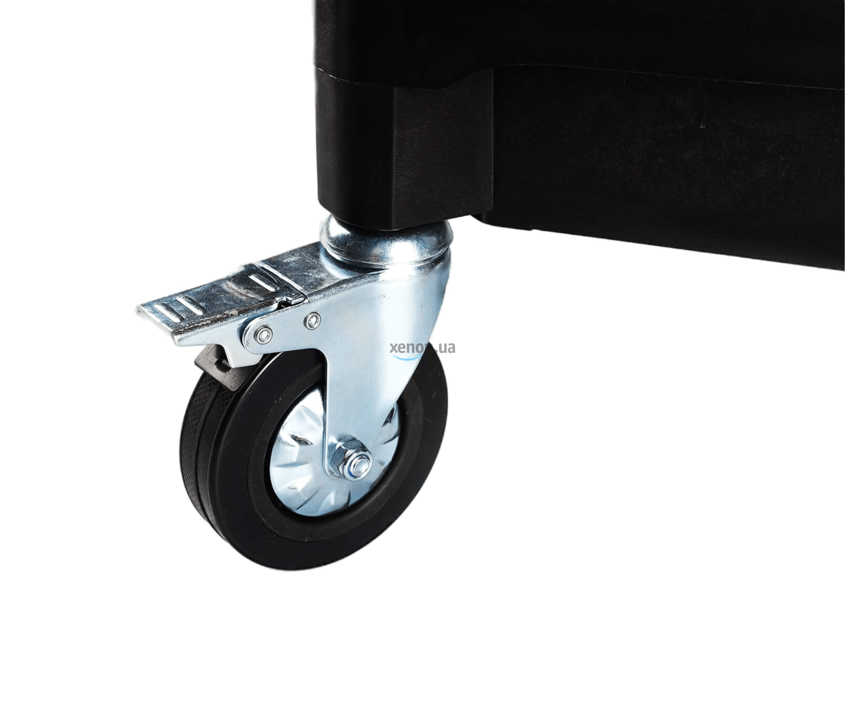 На бічних перфорованих панелях – 12 гачків для підвішування інструменту та аксесуарів. Їх можна комбінувати, як конструктор Lego, під поточні потреби. Маневреність візка забезпечують 4 зносостійкі колеса з гальмівними механізмами (на двох) та міцні пластикові ручки.