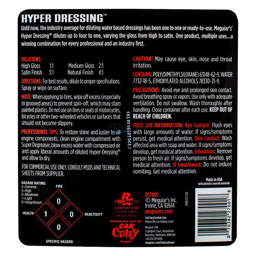 Високоефективний засіб на водній основі Meguiar's Hyper Dressing D170 використовується для натирання пластикових та вінілових деталей автомобіля, надає їм блиск, інтенсивність якого відрізняється залежно від ступеня розведення засобу.