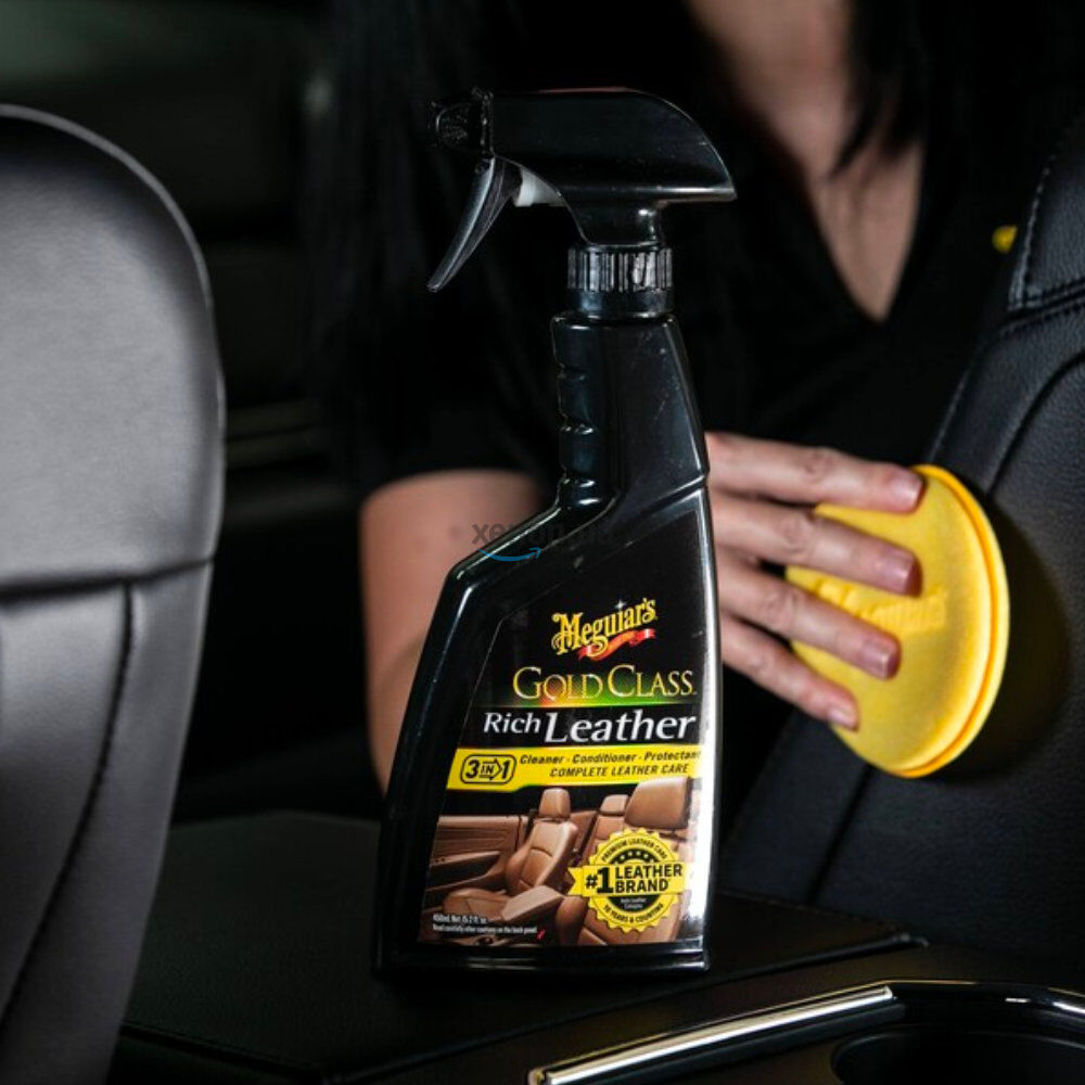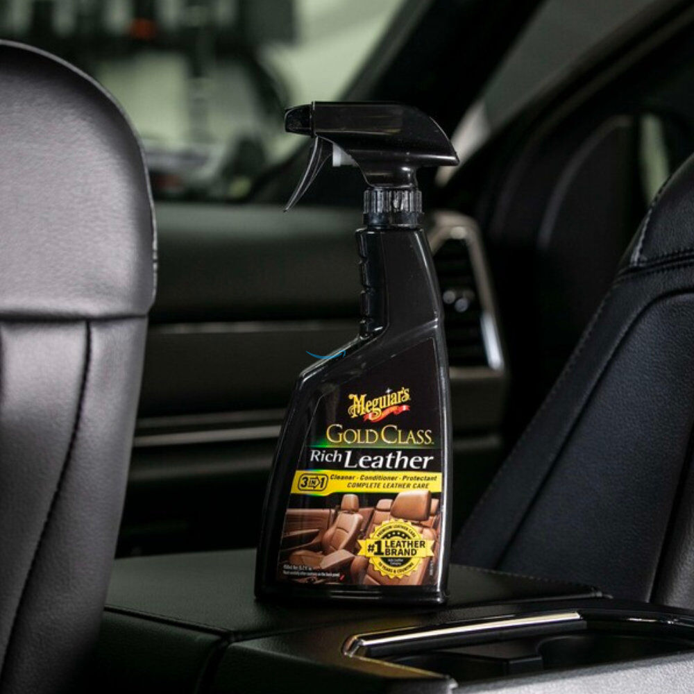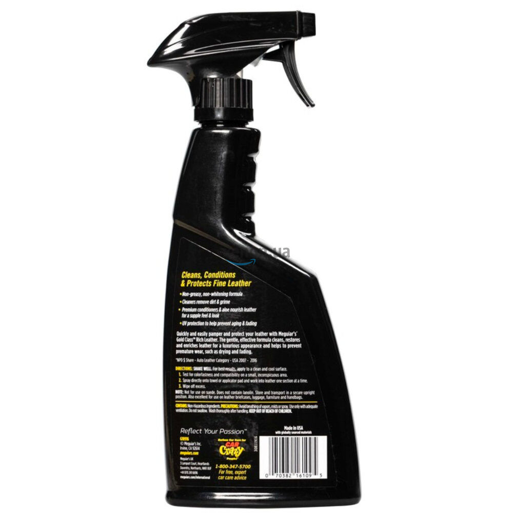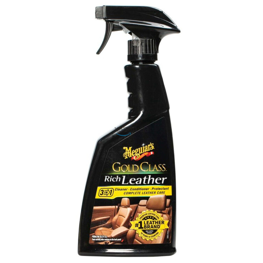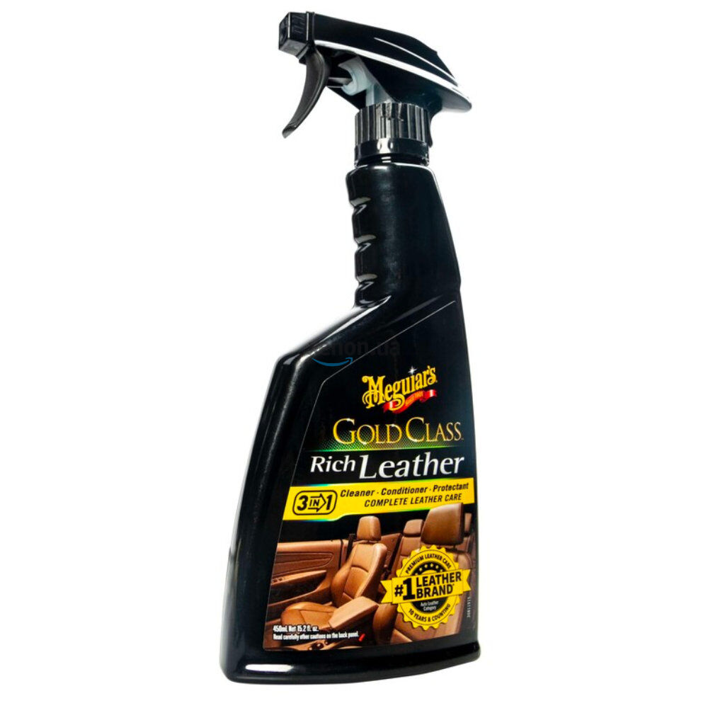 Очищувач, кондиціонер та захист для шкіряного салону в одному флаконі Meguiar`s Gold Class Rich Leather 3 in 1 G10916. Випускається у зручній формі спрею. Робить шкіру приємною та м'якою навпомацки. Захищає салон від негативного впливу УФ-променів та вигоряння, висихання.