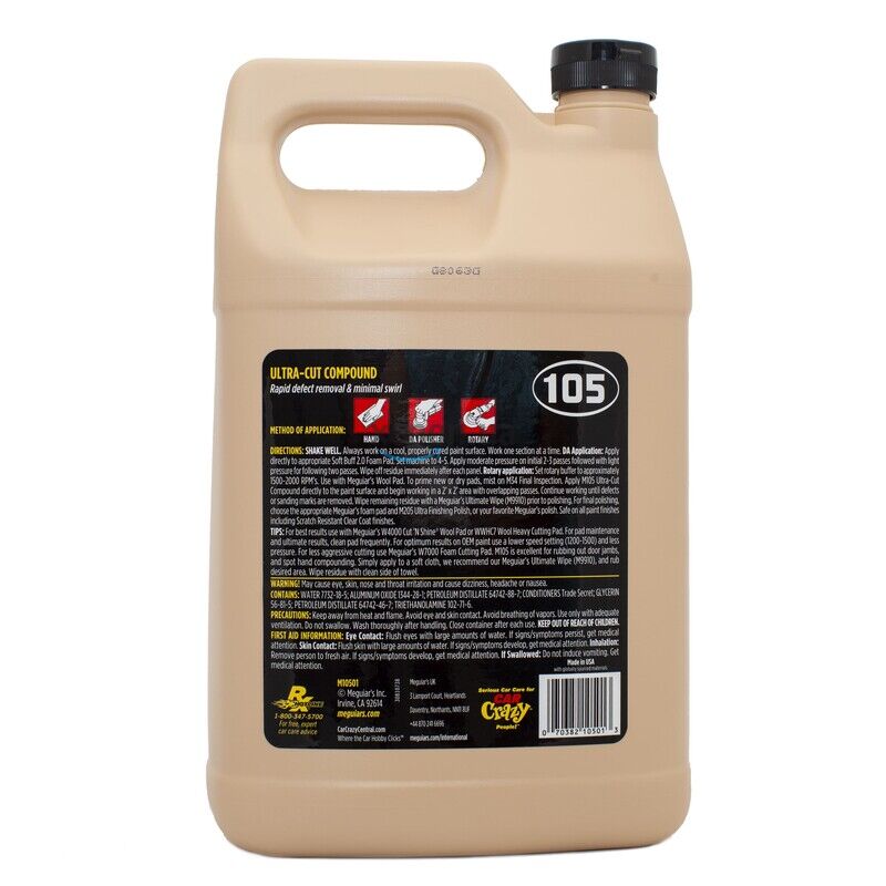 Паста Meguiar's M105 містить у складі найтонший мікроабразив, розроблена для швидкого полірування всіх типів лаків. Швидко видаляє подряпини, розлучення, сліди окиснення, насічку, голограми, сліди шліфування до Р1500.