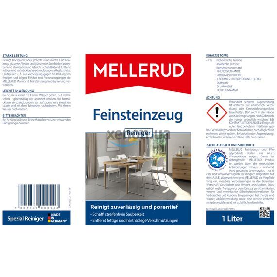 Засіб для чищення керамограніту MELLERUD діє незалежно від поверхні, наприклад проти жирних і стійких забруднень, слідів від підборів або потертостей. Крім того, цей продукт не утворює шарів, отже, на обробленій поверхні не залишається небажаної плівки. Засіб для керамограніту відрізняється простотою застосування: досить просто додати засіб в чистячу воду і обробити поверхні, як зазвичай, за допомогою щітки.