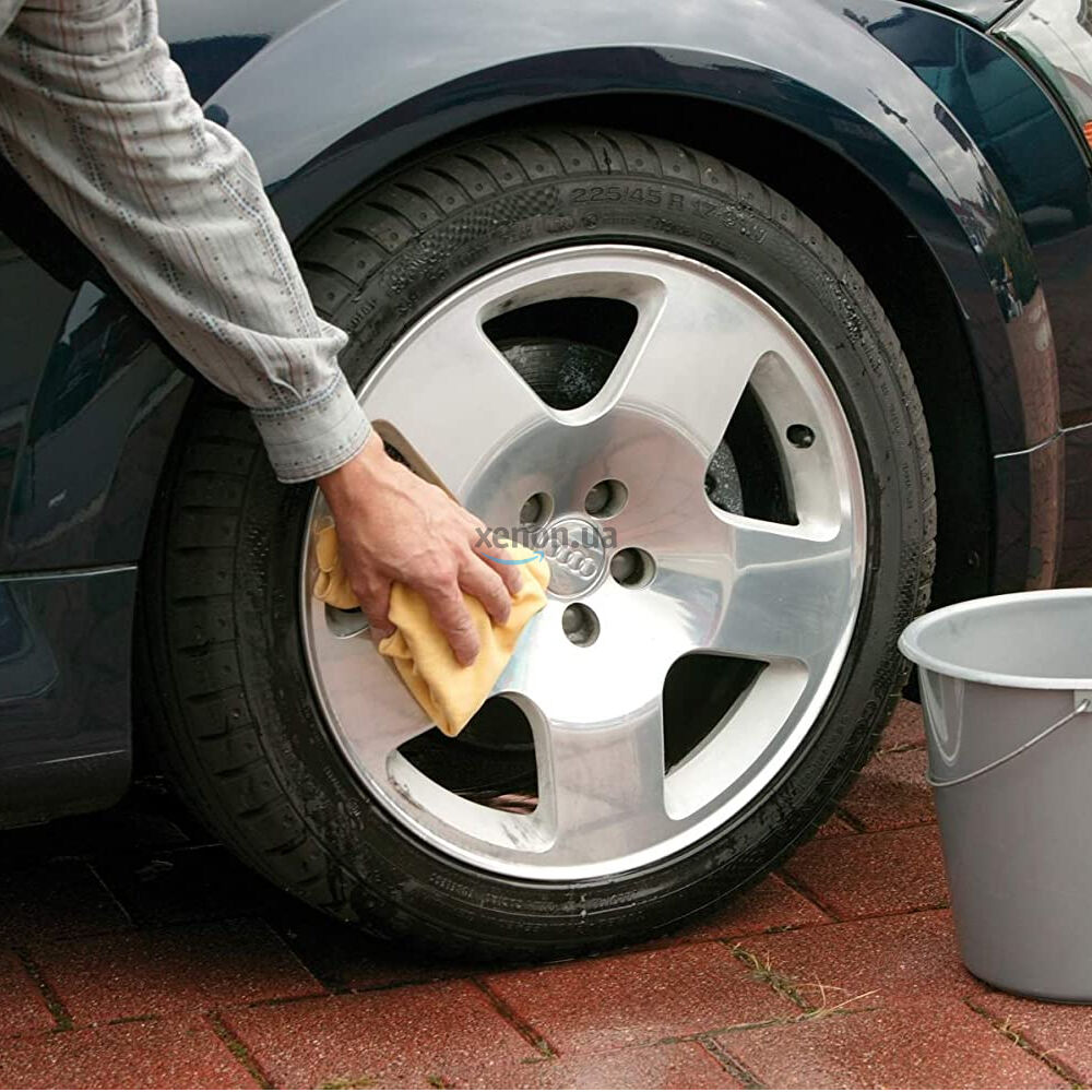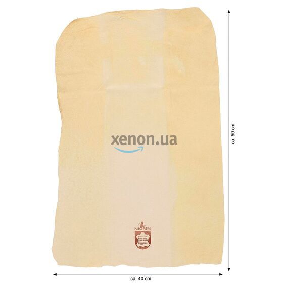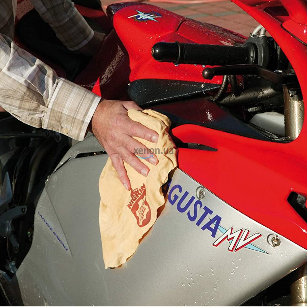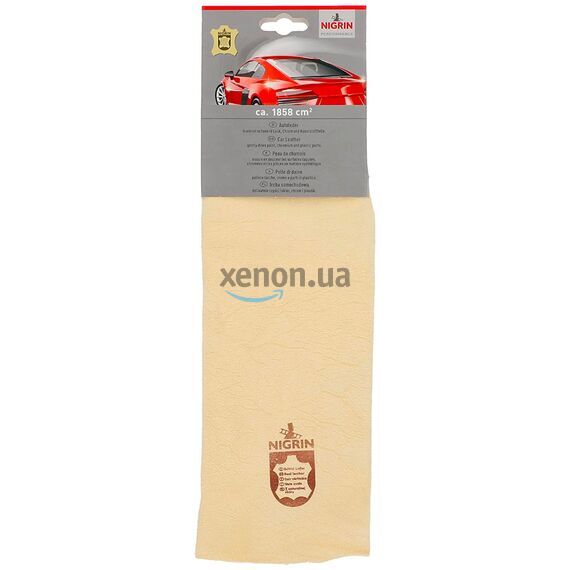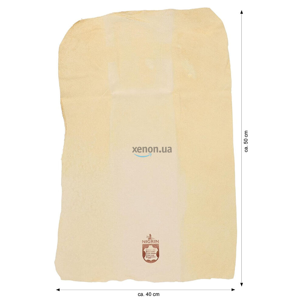 Німецька екстра всмоктуюча ніжна серветка з натуральної шкіри для сушіння авто без розлучень NIGRIN Autoleder площею 1858 см2. Ніжно сушить фарбу, скло, пластик та шкіру, не залишаючи розлучень. Як і всі шкіряні серветки, нарізається із суцільного шматка шкіри, тому обріз може бути не ідеально рівним. : 1858 см2