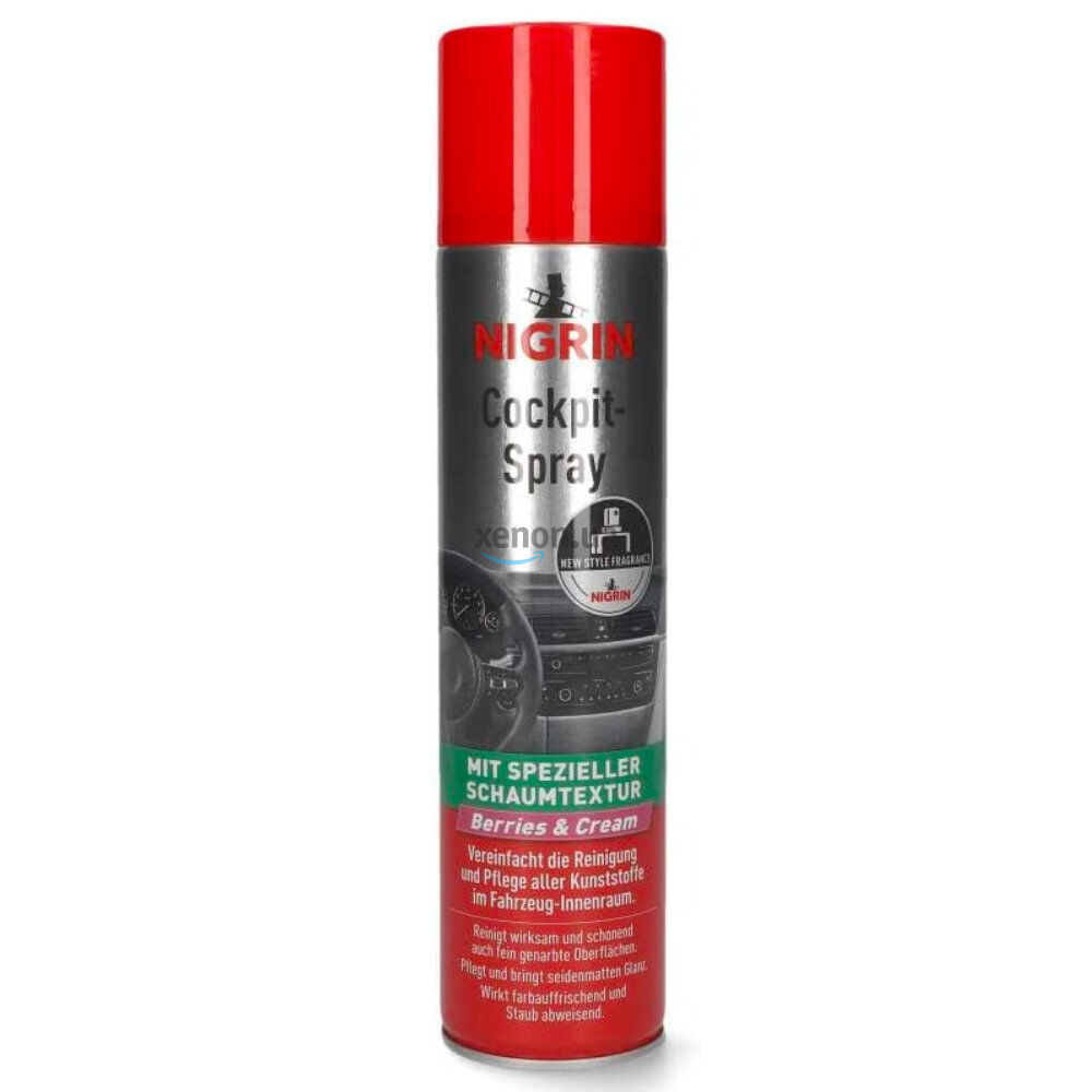 Німецький пінний очищувач протектант для пластику з запахом ягід та крему NIGRIN Cockpit-Spray Berries & Cream на 400 мл сумісний з усіма типами пластику, вінілу, хрому. Він легко та нешкідливо очищає навіть глибокі забруднення, потім залишає приємний запах та захисний шар від УФ-променів та пилу.