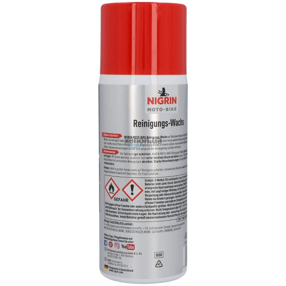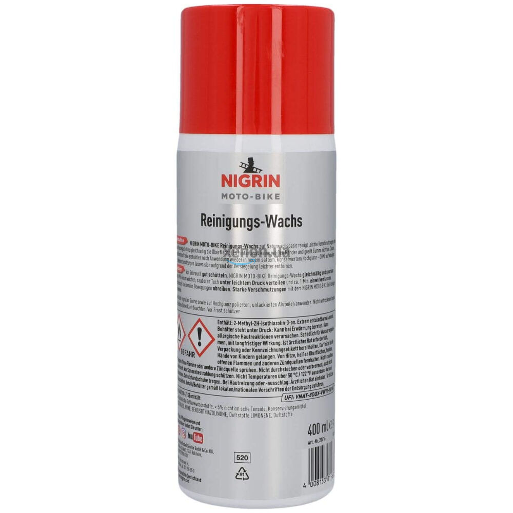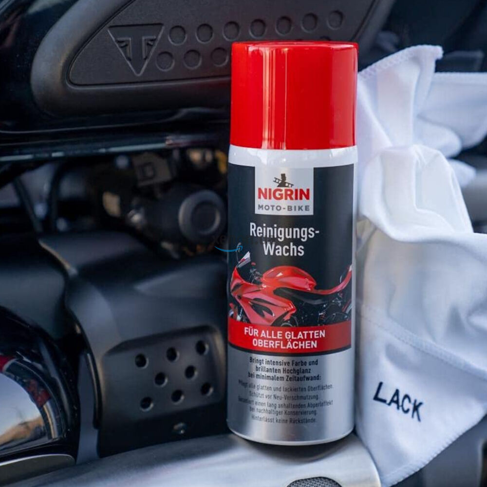 Німецький водовідштовхуючий восковий консервант для мотоциклів, мото- та вело-техніки NIGRIN Moto-Bike Reinigungs-Wachs Aerosol на 500 мл. Підходить для швидкого очищення (мийки без води) та для захисту гладких та окражених деталей. На восковій основі. Надає поверхні блиск і сильний гідрофобний (водовідштовхуючий та грязевідштовхувальний) ефект. Також підходить для самокатів. li