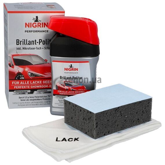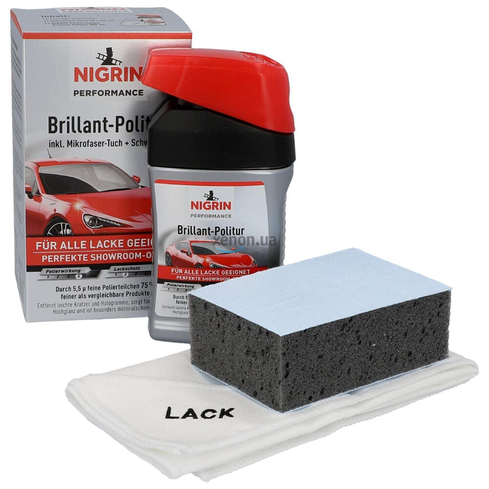 Німецький набір містить мікрофібру, аплікатор для полірування іочищений абразивний поліроль NIGRIN Performance Brillant-Politur Turbo - це абразивний поліроль з мінімальним вмістом воску і максимальним абразивом для видалення подряпин , оксидів, слідів біутма, плям, огріхів. Це підготовча поліроль, перший крок обробки перед нанесенням воскового поліролю чи захисних покриттів, восків, силантів. Чи не ушкоджує поверхню, може бути використаний як з полірувальною машинкою, так і для ручної обробки. Прибирає потьмяніння фарби, відновлює лак, що вигорів. Повертає лако барвистому покриттю початковий блиск.