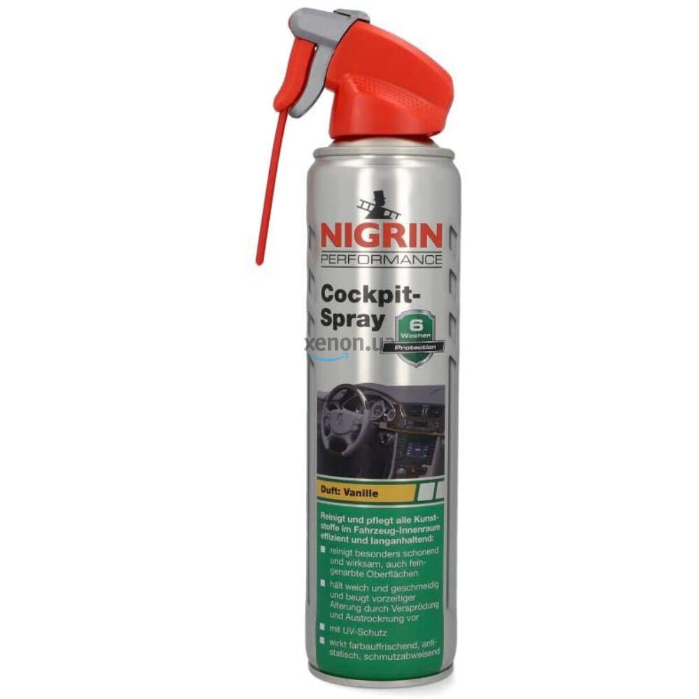 Німецький40-денний очищувач протектант для пластику із запахом Ваніль NIGRIN Cockpit-SprayNeutral на 400 мл сумісний з усіма типами пластику, вінілу, хрому. Він легко та нешкідливо очищує навіть глибокі забруднення, потім залишає приємний запах та захисний шар від УФ-променів та пилу.