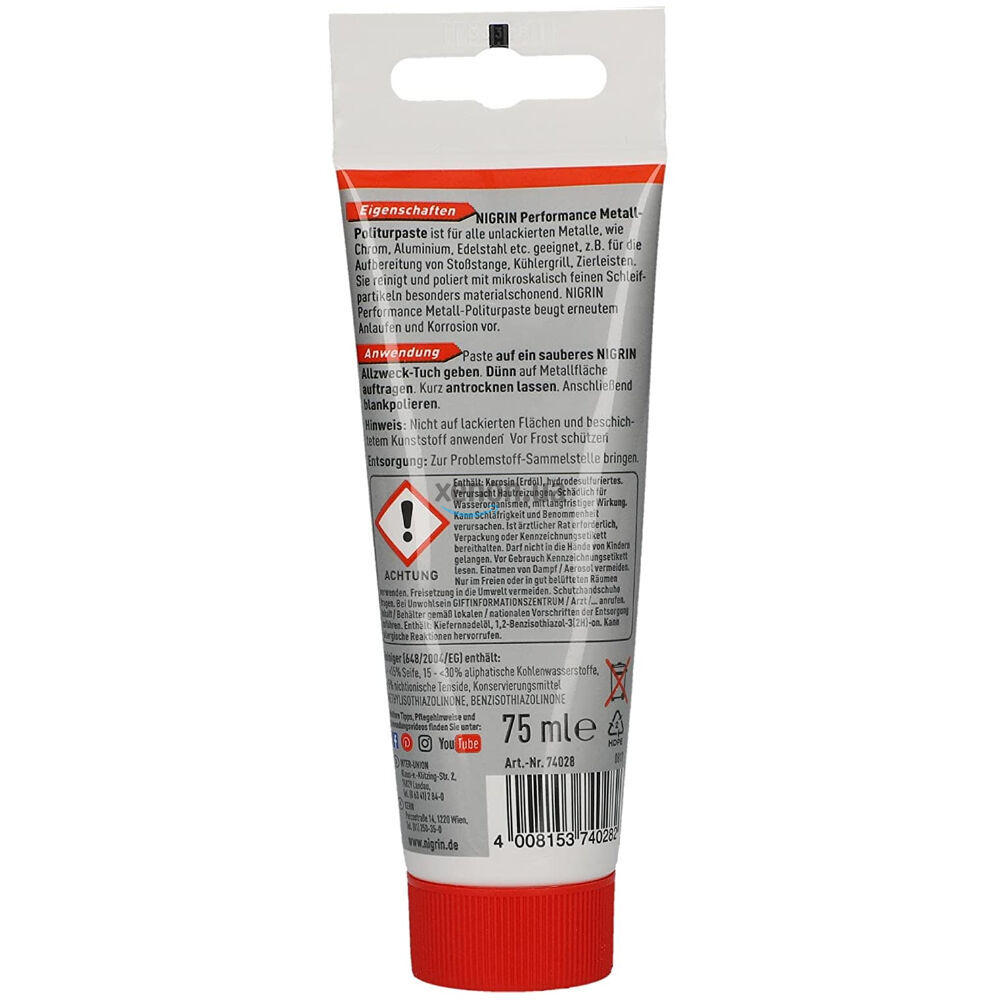 Німецька поліроль для незабарвлених металів та хрому NIGRIN Performance Metal-Politurpaste  - це ніжний поліроль для очищення та відновлення блиску, видалення подряпин для алюмінію, хрому, металевих поверхонь, нержавіючої сталі та інших металевих поверхонь. Інтенсивно та ніжно очищає та полірує, захищає поверхню, видаляє подряпини, відновлює природний блиск та гладкість поверхні. Запобігає повторному потьмаренню та корозії.
