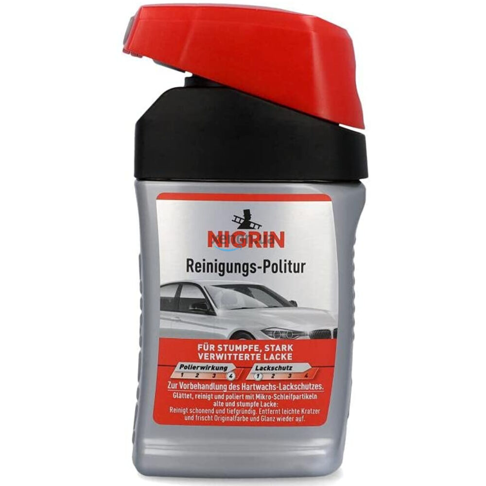 Німецький очищений абразивний поліроль NIGRIN Reinigungs-Politur - це абразивний поліроль з мінімальним вмістом воску та максимальним абразивом для видалення подряпин, очищення лаку від пилу, оксидів, слідів біутму,. Це підготовча поліроль, перший крок обробки перед нанесенням воскового поліролю чи захисних покриттів, восків, силантів. Чи не ушкоджує поверхню, може бути використаний як з полірувальною машинкою, так і для ручної обробки. Прибирає потьмяніння фарби, відновлює лак, що вигорів. Повертає лако барвистому покриттю початковий блиск.