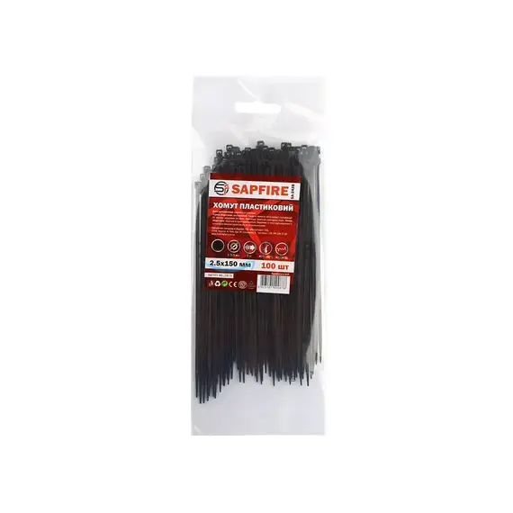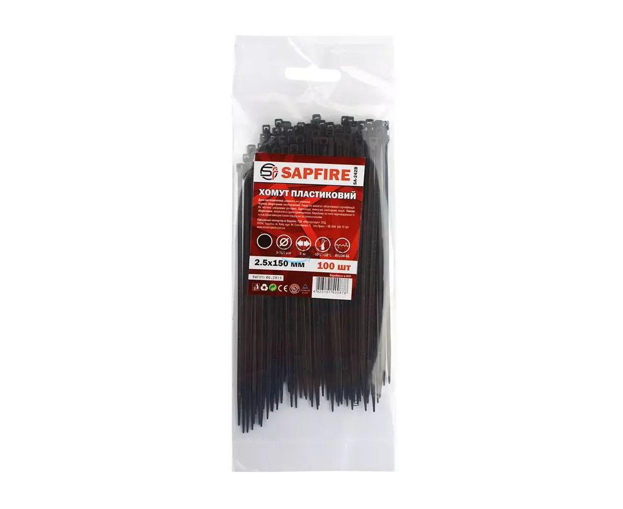 Хомут пластиковий 2,5х150 мм 100 шт чорний SAPFIRE (400878) — виготовлений із міцного матеріалу Nylon-66 (різновид поліаміду) з високими електроізоляційними характеристиками, стійкий до УФ-випромінювання.