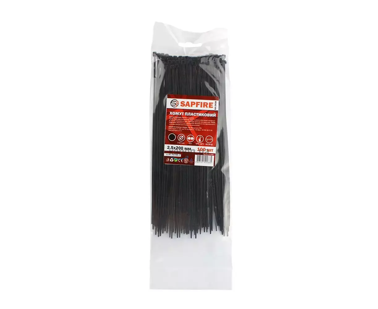 Хомут пластиковий 2,5х200 мм 100 шт чорний SAPFIRE (400885) — виготовлений із міцного матеріалу Nylon-66 (різновид поліаміду) з високими електроізоляційними характеристиками, стійкий до УФ-випромінювання.