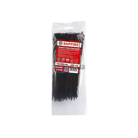 Хомут пластиковий 3,6х300 мм 100 шт чорний SAPFIRE (401042) — виготовлений із міцного матеріалу Nylon-66 (різновид поліаміду) з високими електроізоляційними характеристиками, стійкий до УФ-випромінювання.