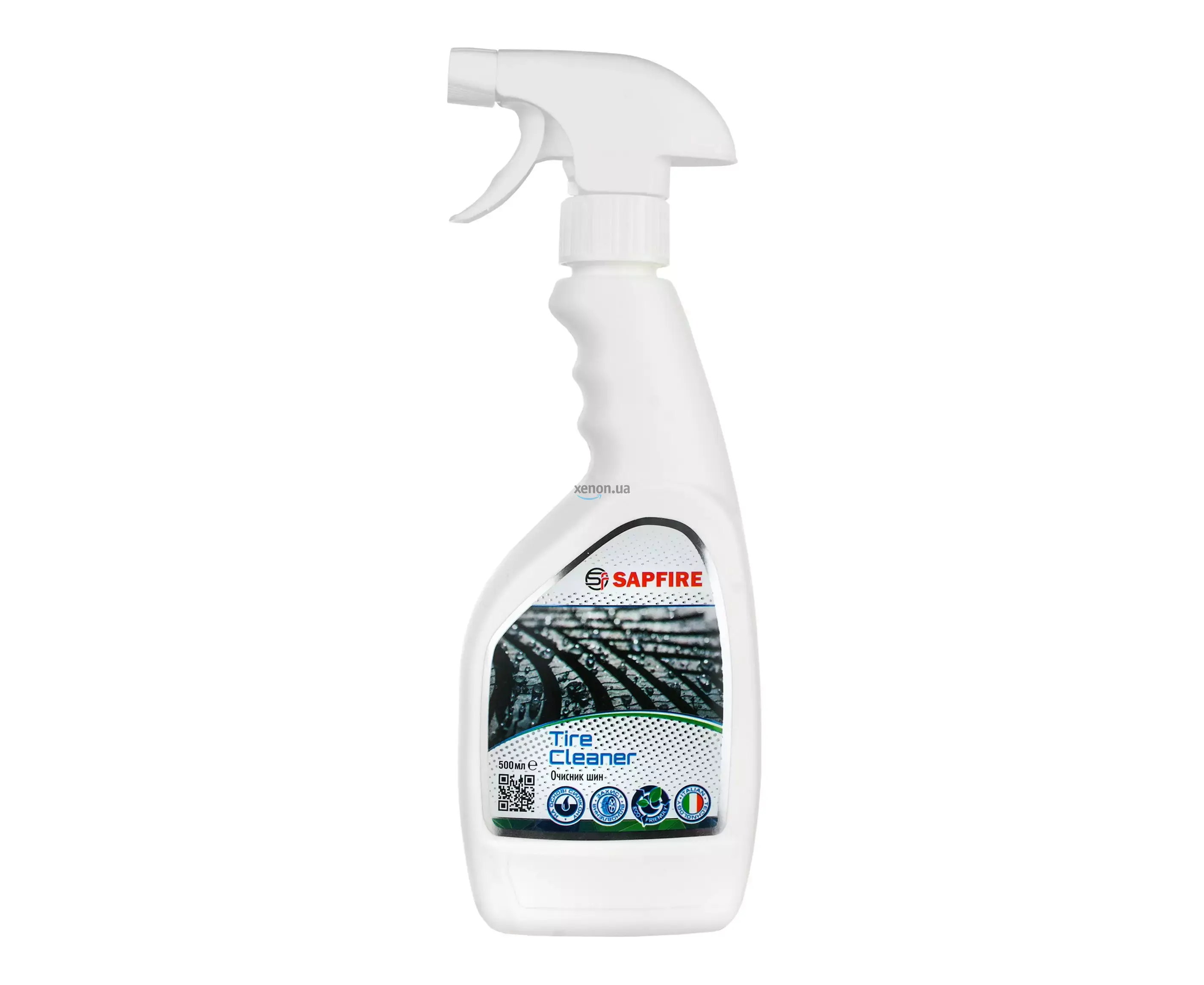 Очищувач шин SAPFIRE Tire Cleaner 500 мл (750448) - засіб на основі силікону для відновлення та захисту шин і гумових елементів. Утворює захисну силіконову плівку, яка оберігає шини від старіння, висихання, утворення мікротріщин, температурних впливів і знебарвлення, робить поверхню шин більш стійкою до всіх видів забруднень. Надає автомобільним шинам насичений чорний колір. Допомагає зберегти еластичність гуми, запобігає примерзанню ущільнювачів при мінусовій температурі. Не містить фосфатів. Біологічно розкладається.