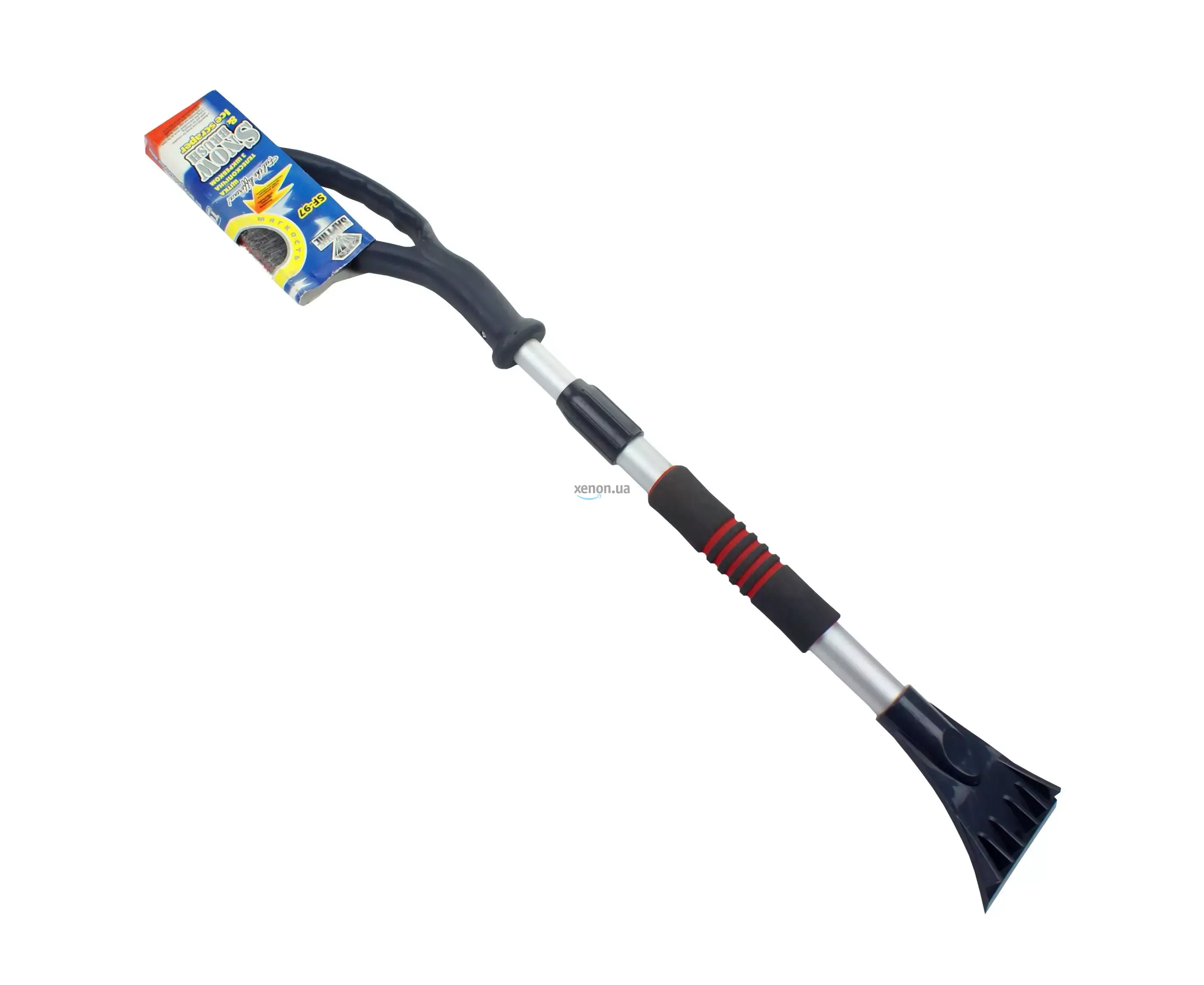 Щітка зі скребком та телескопічною алюмінієвою ручкою SF-97 SAPFIRE (000548). Діаметр алюмінієвої трубки 22/26 мм. Ручка-тримач двоколірна неопренова. Щетина щітки двоколірна, розпушена довжиною 6 см, товщина ворсу щітки 20 мм. Довжина ворсової частини щітки – 20 см.