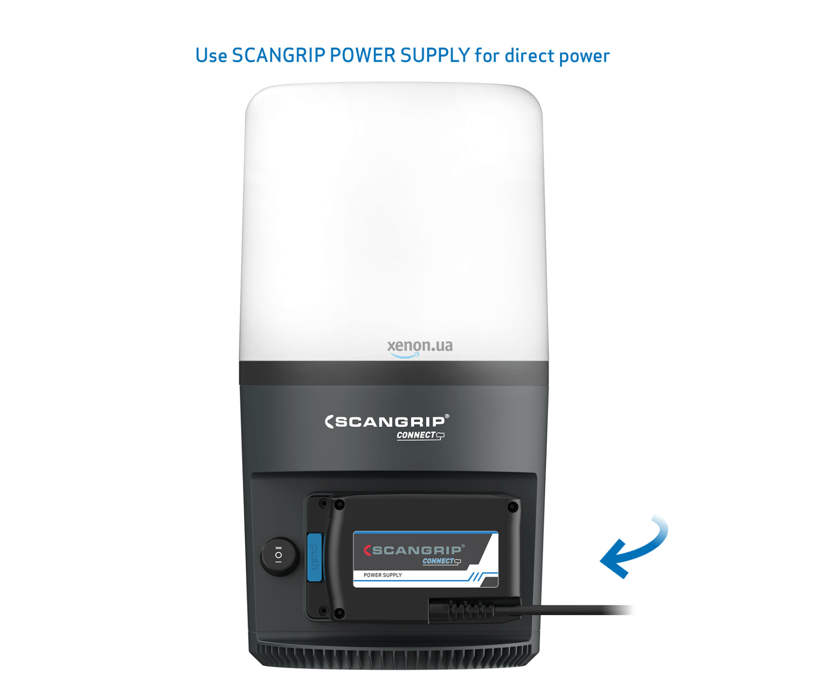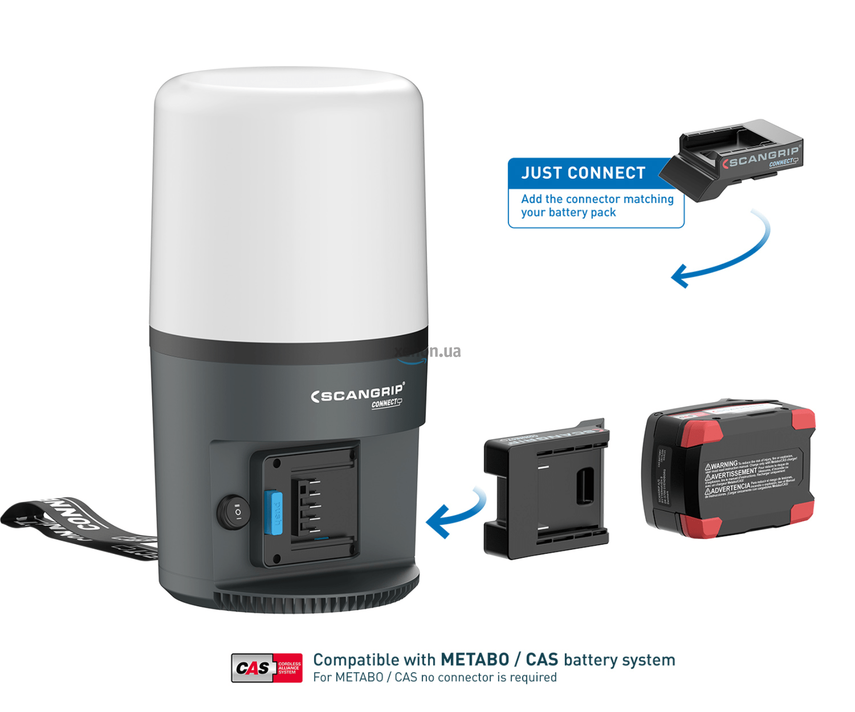 Лампа сумісна з акумуляторною системою METABO/CAS 18В та іншими акумуляторами 18В/20В за допомогою перехідника Scangrip Connector. Це дозволяє живити пристрій від більшості популярних акумуляторів. Також лампа може працювати від мережі.