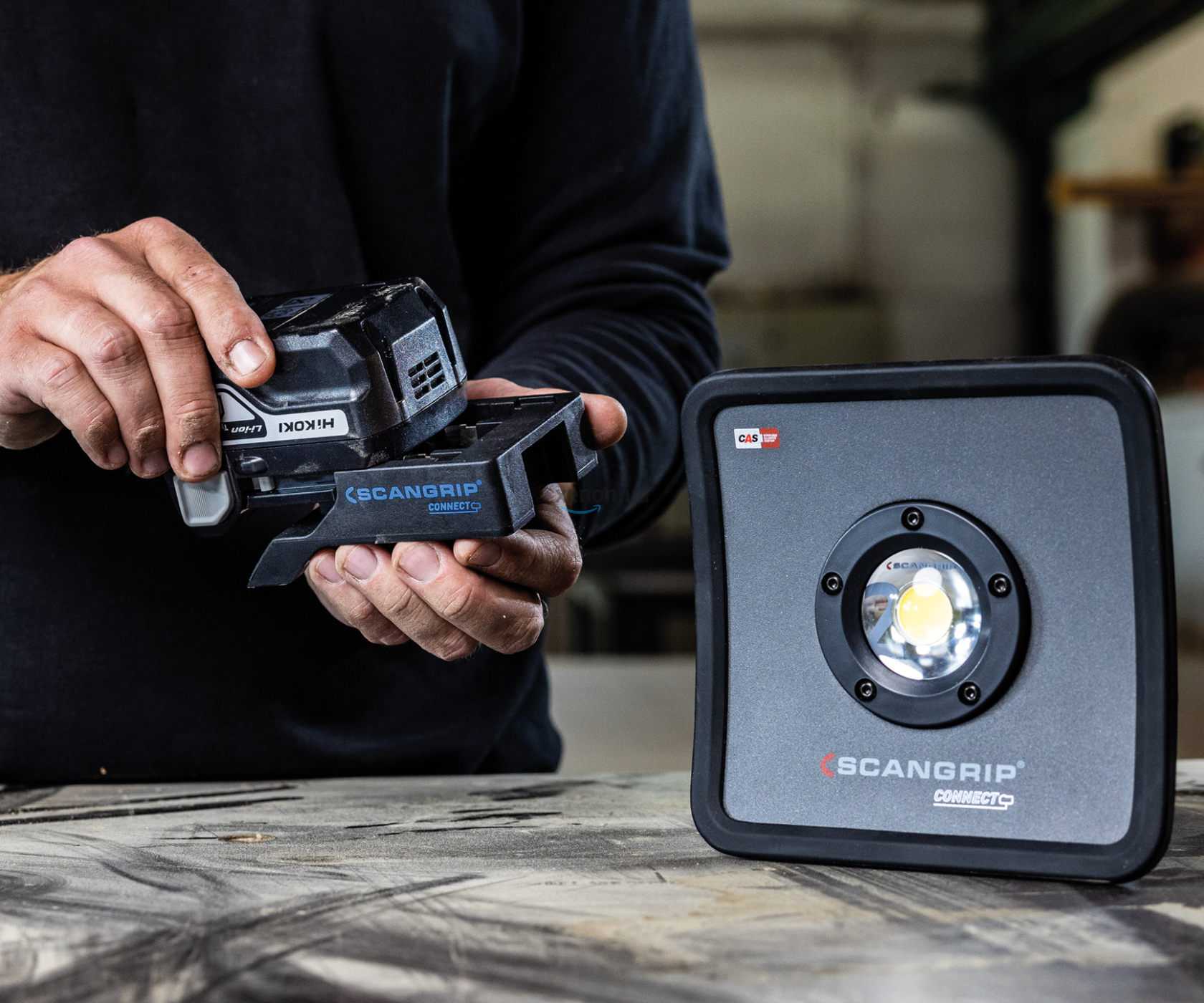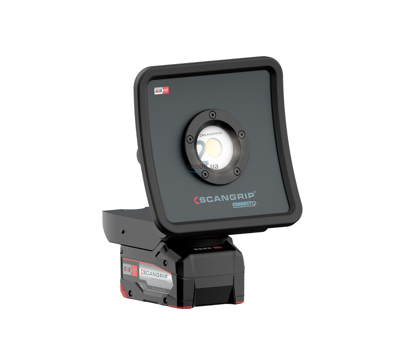 Передбачено п'ять режимів освітлення: від 10 до 100% загальної яскравості. Індикатори заряду акумулятора та поточної яскравості (разом із клавішами керування) винесені у верхню частину корпусу. Прожектор сумісний з акумуляторною системою METABO/CAS 18В та іншими акумуляторами 18В/20В під час використання перехідника Scangrip Connector. Це дозволяє живити пристрій від батарей більшості популярних електроінструментів - дрилів, шуруповертів, полірувальних машинок і т.д. Вбудований блок живлення має USB-роз'єм для заряджання мобільних пристроїв, а внутрішній резервний акумулятор може забезпечити додаткові 50 хвилин роботи при 200 люменах.