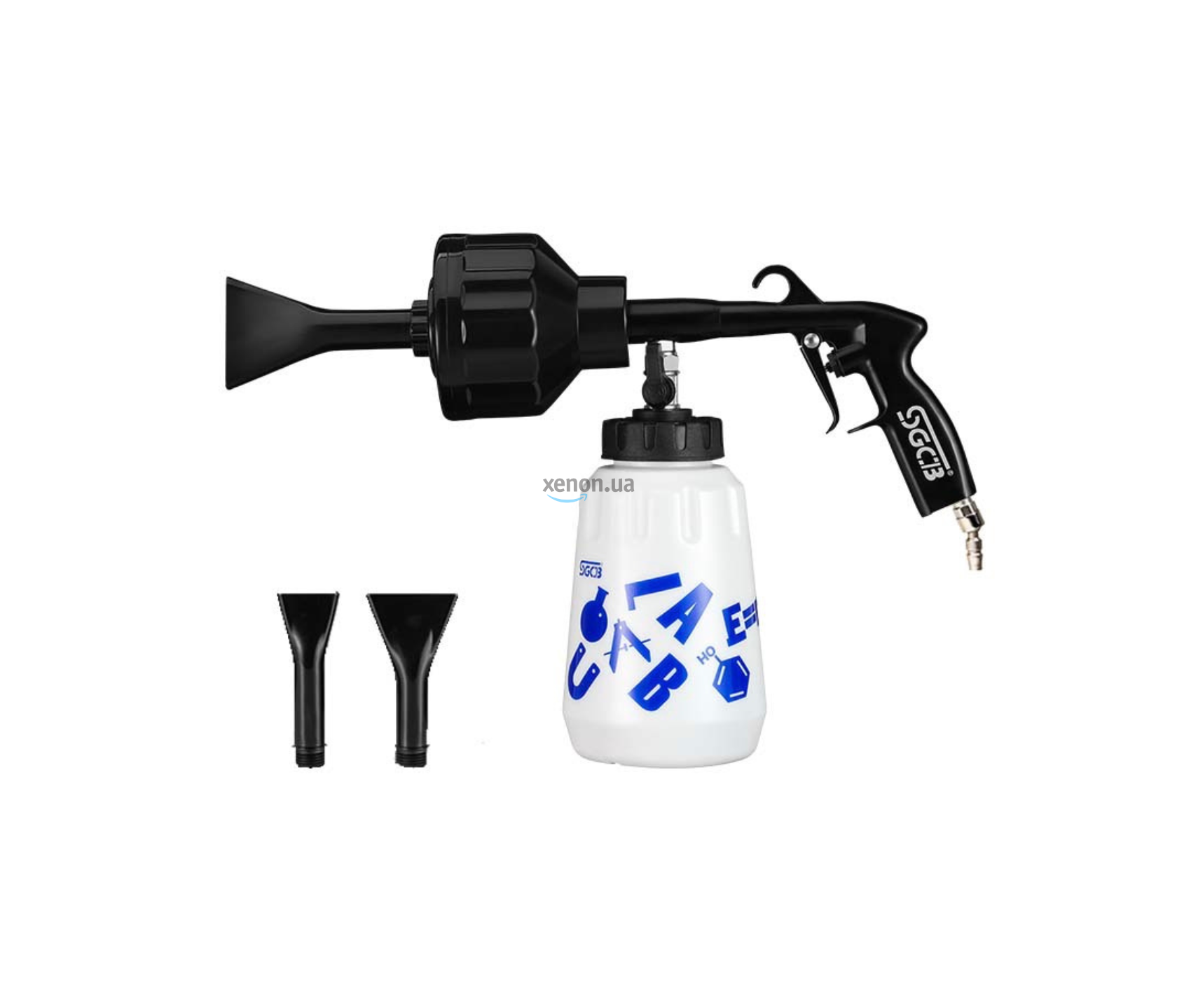 SGCB Car Foam Gun – пінний пістолет із двома насадками для зміни кута подачі піни. Застосовується для збивання автошампуня в густу та легку піну, яка чіпляється за вертикальні поверхні, не стікаючи вниз.