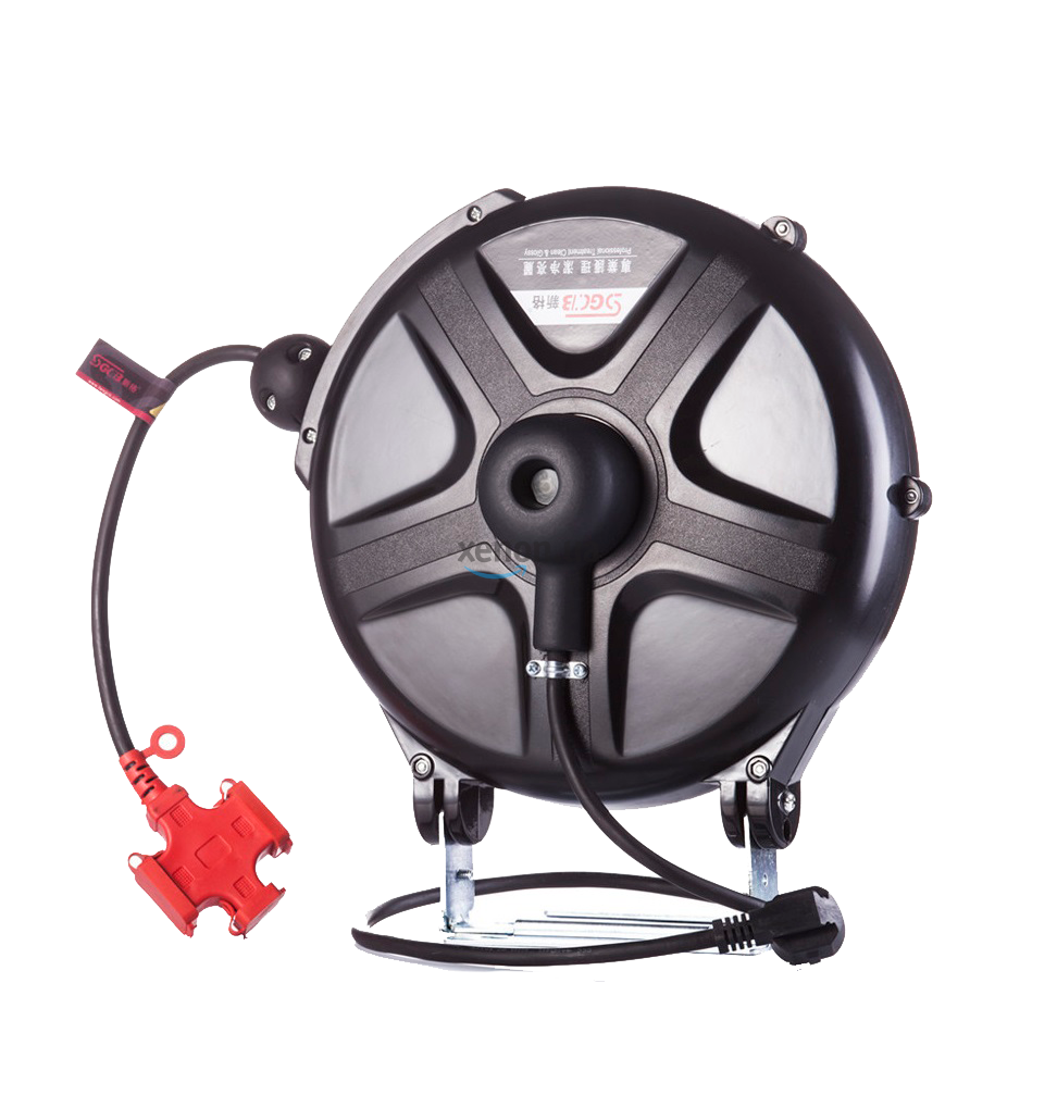 Промисловий подовжувач SGCB Electric Hose Reel має варіанти кріплення до стелі або стіни, обладнаний 10-метровим кабелем для підключення електроінструменту. Подовжувач обладнаний стоппером для фіксації вилки електроприладу.