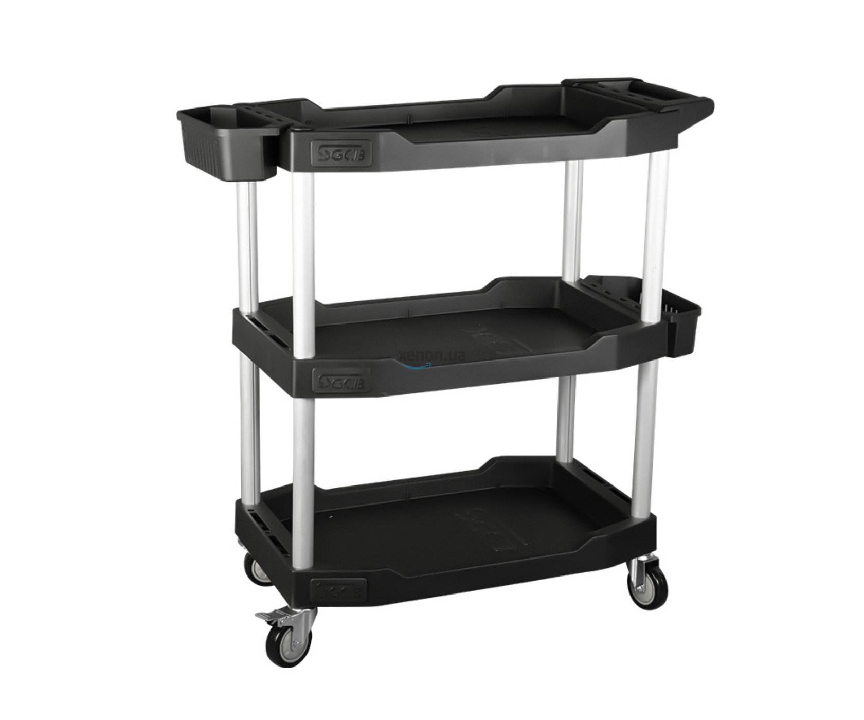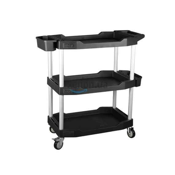 SGCB Multifunction 3-Tier Utility Cart – пластиковий трирівневий візок для зберігання та транспортування інструментів та автохімії. Каркас виконаний з легкого та міцного алюмінію. Полиці з ABS-пластику дозволяють ергономічно розмістити всі речі так, як це необхідно майстру під час роботи. Мобільність візка забезпечують колеса з кутом повороту в 360 градусів та пластикові ручки.