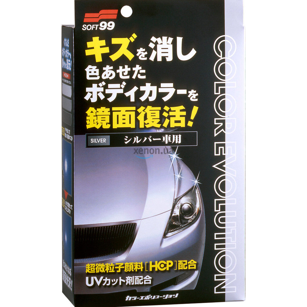 Колір збагачуючий поліроль для сріблястих автомобілів SOFT99 Color Evolution Silver 00502. Color Evolution — кольорозбагачувальна поліроль повністю маскує дрібні пошкодження в шарі фарби, заповнюючи їх уретановою смолою з акриловим барвником. Пігментні мікрочастинки, що входять до складу поліролі, легко проникають у найдрібніші тріщини і застигаючи в них блискуче відновлюють початковий колір автомобіля. Крім того, сучасні полімерні технології у складі даного продукту створюють бар'єр для вицвітання лакофарбового покриття на період дії складу.