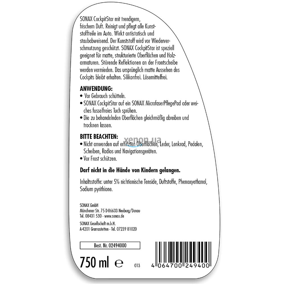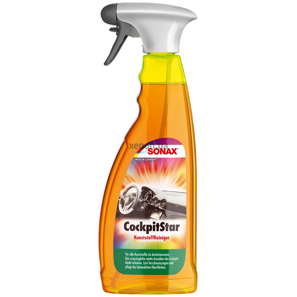 Очищувач-поліроль пластику SONAX Cockpit Star 750 мл 249400 з модним свіжим ароматом. Очищає та доглядає за всіма пластиковими деталями автомобіля. Має антистатичний та пиловідштовхуючий ефект. від повторного забруднення. CockpitStar особливо підходить для матових структурованих поверхонь і дерев'яної фурнітури. матовий поліроль 249 400