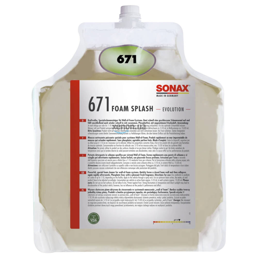 Потужний спеціальний пінний очисник SONAX Foam Splash Evolution 671500. Швидко створює велику закриту пінну стіну, яка потім знову швидко руйнується. Знижує забруднення піногенератора. Добре миється. Зі свіжим ароматом. рН 10.