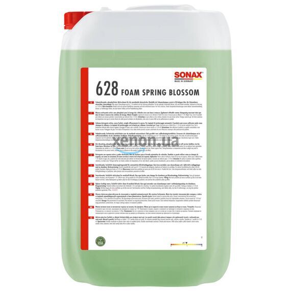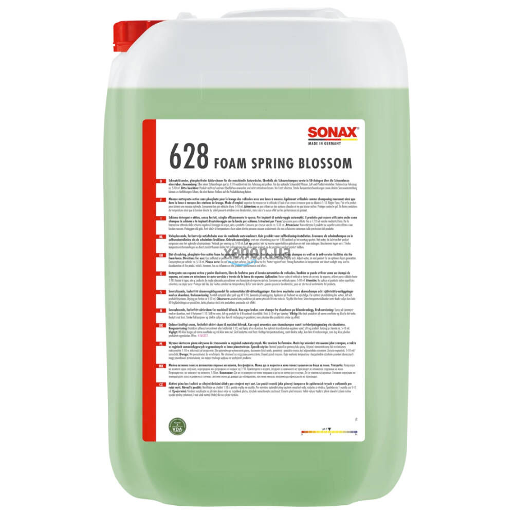 Безфосфатний очищувач SONAX Foam Spring Blossom 628705 з активною піноутворюючою здатністю для видалення комах та інших засохлих забруднень в автомийках. З екстра-свіжим ароматом кондиціонера для білизни. значення рН 7.