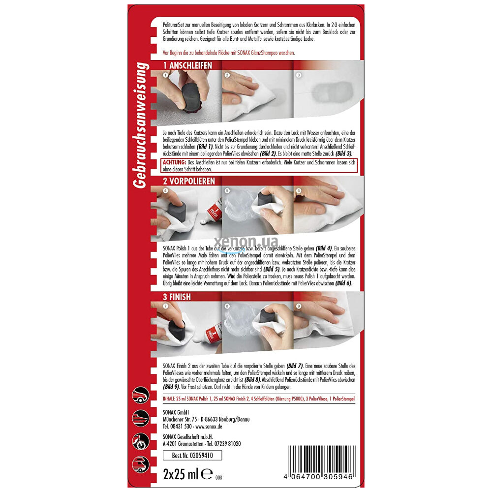 Набір для видалення подряпин SONAX KratzerEntferner Set 50 мл 305941. Набір поліролей для ручного видалення локальних подряпин і потертостей з лаків. Навіть глибокі подряпини можна видалити за 2-3 простих кроки, за умови, що вони не досягають базового шару або грунтовки. Для кольорових і металізованих, а також стійких до подряпин. фарб.