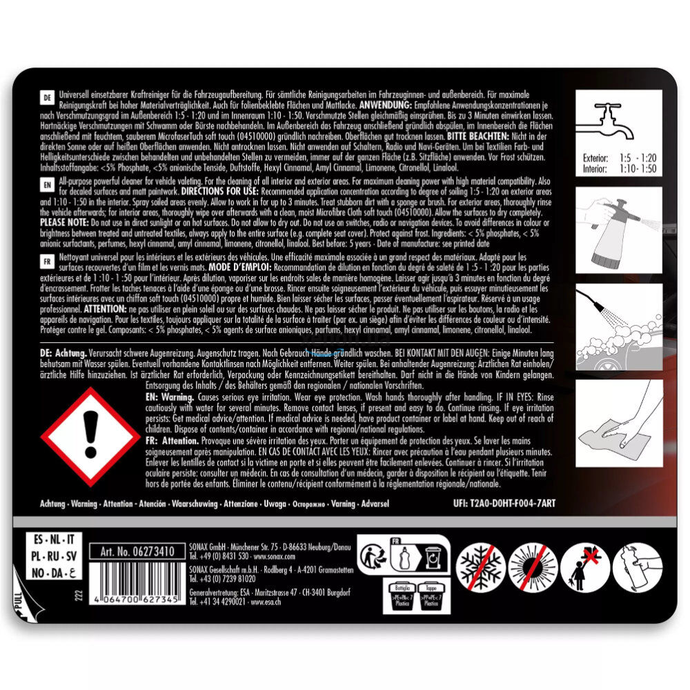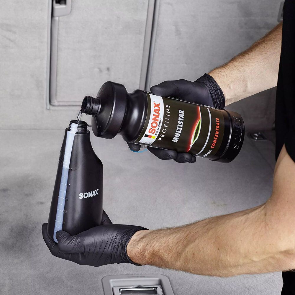 Концентрований універсальний засіб для чищення інтер'єру та екстер'єру від Sonax (до 200 літрів готового продукту). Sonax Multistar застосовується для догляду за всіма поверхнями автомобіля, а також попередньої підготовки автомобіля в автоматичних мийках. Sonax Multistar володіє високими очищаючими якостями та сумісністю з матеріалами. Застосовуємо для будь-яких робіт з очищення як внутрішніх, так і зовнішніх елементів автомобіля. Склад застосовується для використання з обладнанням для очищення під високим тиском, гарячою водою та парою, а також для ручного нанесення.