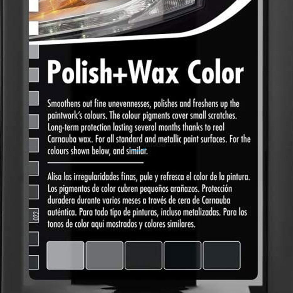 Чорний поліроль містить кольорові пігменти фарби з восковими компонентами. Він розгладжує, полірує та зберігає всі види покриттів за один прохід. Усуває невеликі черевини та збагачує колір автомобіля. Погані ділянки лакофарбового покриття покриваються кольоровими пігментами і захищаються від корозії. Polish +Wax Color надає лакофарбовому покриттю яскравого кольору, забезпечує відмінний блиск та довготривалий захист від атмосферних впливів завдяки натуральному воску карнаубу.