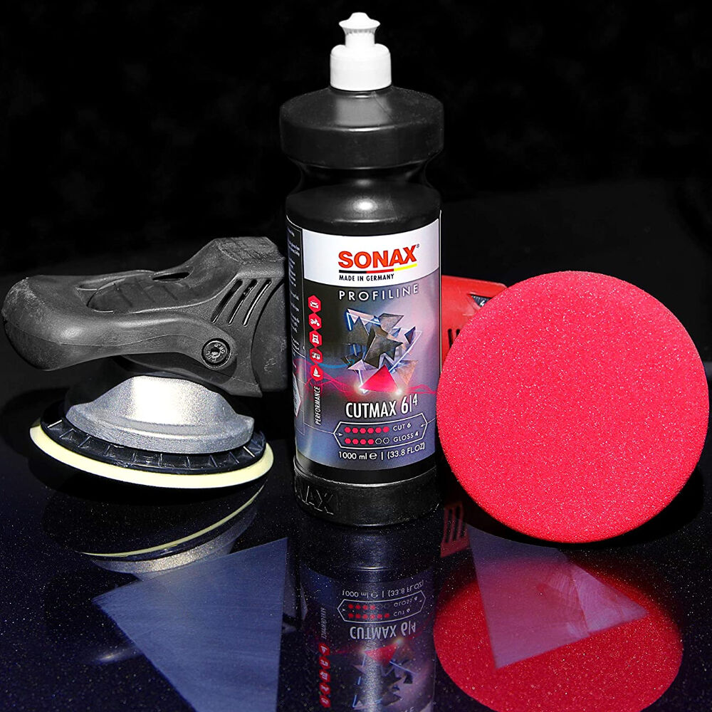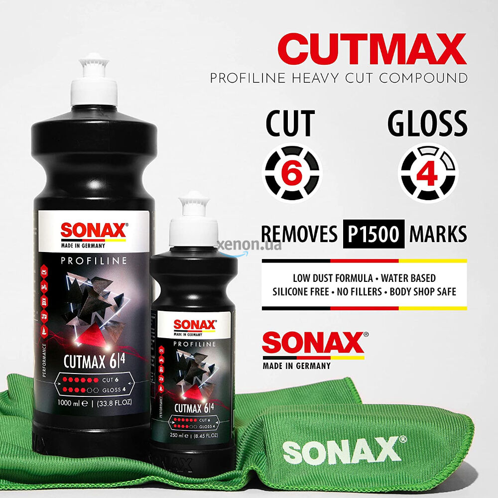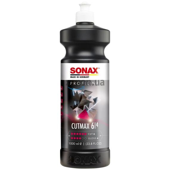 Абразивна паста для полірування кузова SONAX PROFILINE CutMax 06-04 1 л 246300. Професійний поліроль для кузова автомобіля спеціально розроблений для одноступеневого полірування локальних вкраплень лакофарбового покриття, таких як частинки. пилу або потіки лаку, видаляє сліди від полірування зернистості P1500 або дрібніше, не ушкоджуючи прозоре покриття. Спеціальні наноабразиви забезпечують хороше видалення подряпин і не залишають голограм при поліруванні лакофарбового покриття. li