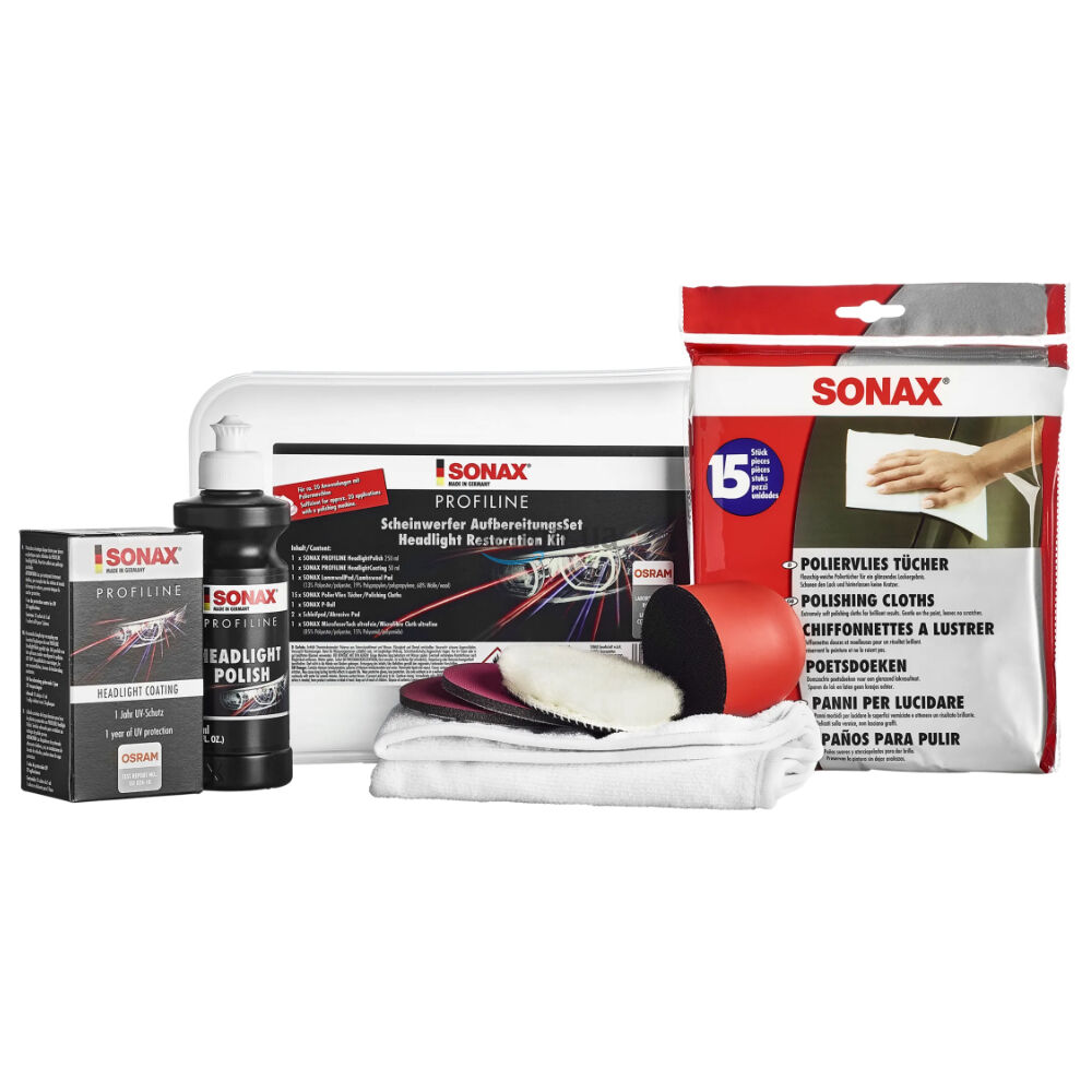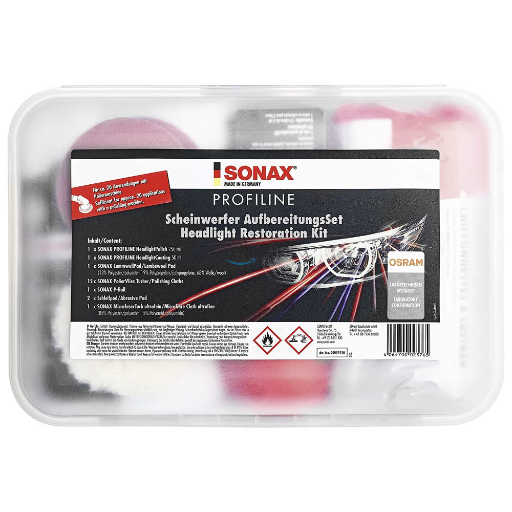 Набір для реставрації та захисту пластикових фар SONAX PROFILINE Headlight Restoration Kit 325 мл 405741. Набір для професійної підготовки пожовклих від старості та матовості пластикових накладок фар. Додаток повертає початкову чіткість фар та забезпечує значно покращену світловіддачу і, отже, велику безпеку водіння. Досить приблизно для 20 застосувань.