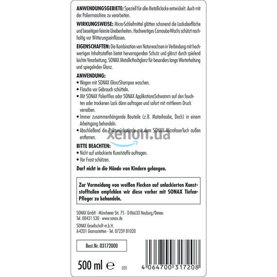 Спеціальний поліроль для всіх металевих фарб. Згладжує, полірує та герметизує лакофарбове покриття особливо дбайливо. Світловідбиваючий блиск та оптимальний довготривалий захист завдяки карнаубському воску. Також можна обробляти полірувальною машиною.