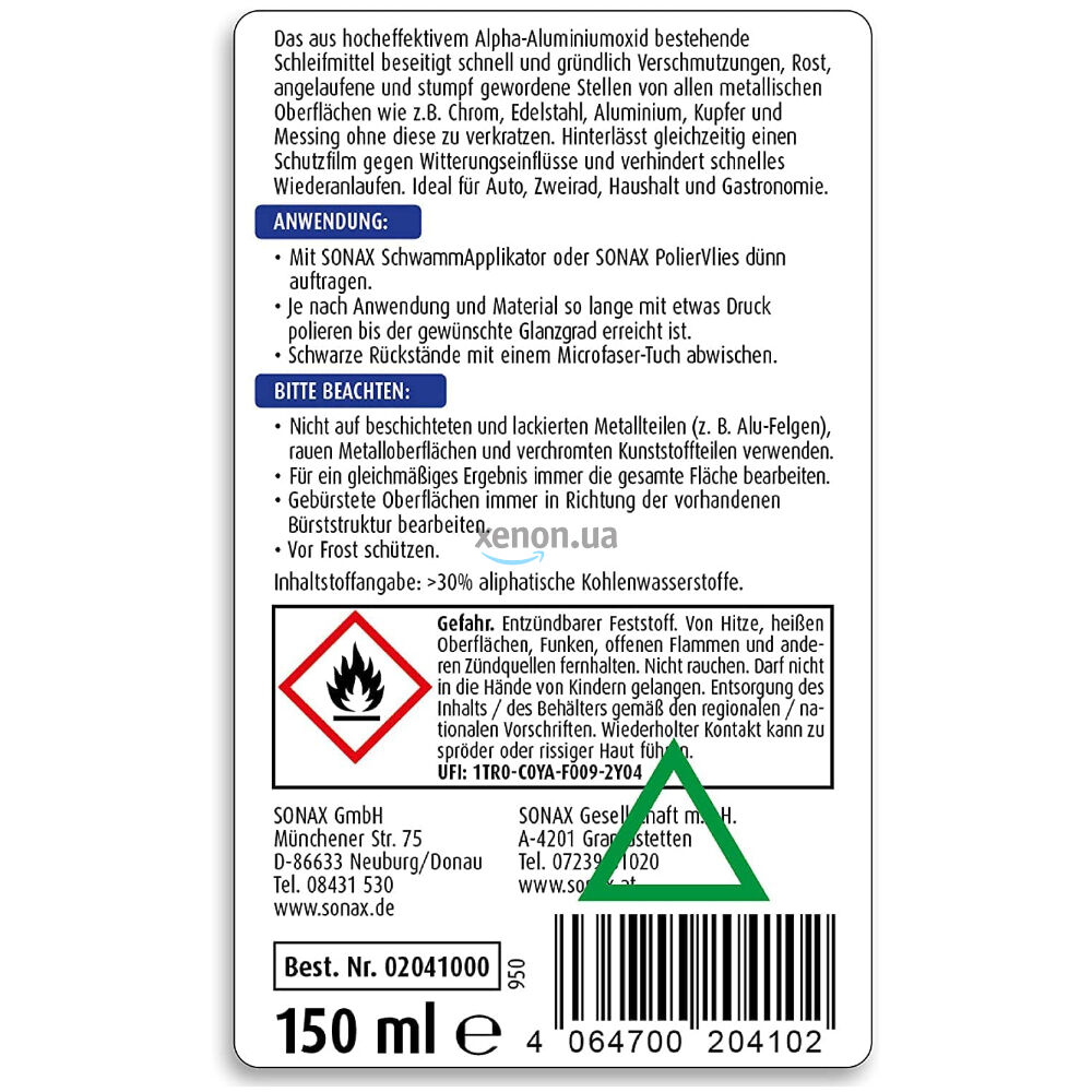 Поліроль для металів SONAX XTREME Metal Polish 150 мл 204100. Абразив, виготовлений з високоефективного альфа-оксиду алюмінію, швидко і ретельно видаляє бруд, іржу, потьмянілі та потьмянілі ділянки з усіх металевих поверхонь, таких як хром, нержавіюча сталь, алюміній, мідь та латунь, не дряпаючи їх. плівку від атмосферних впливів і перешкоджає швидкому перезапуску. Ідеально підходить для автомобілів, велосипедів, домашнього господарства та гастрономії. Сертифікат NSF (A7).