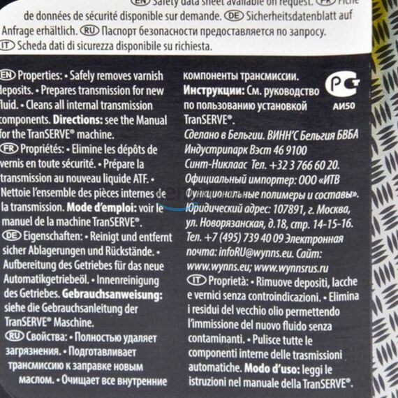 Профессиональная присадка для применения с оборудованием ТрансСерв - промывка коробки передач WYNNS Automatic Transmission Flush Professional Formula W64401 325 мл удаляет налёт и отложения внутри автоматической трансмиссии, создаёт защитный слой трущихся деталей, обеспечивает плавность переключения. Особенно эффективна перед заменой жидкости в автомате. Применять присадку с оборудованием ТранСЕРВ.