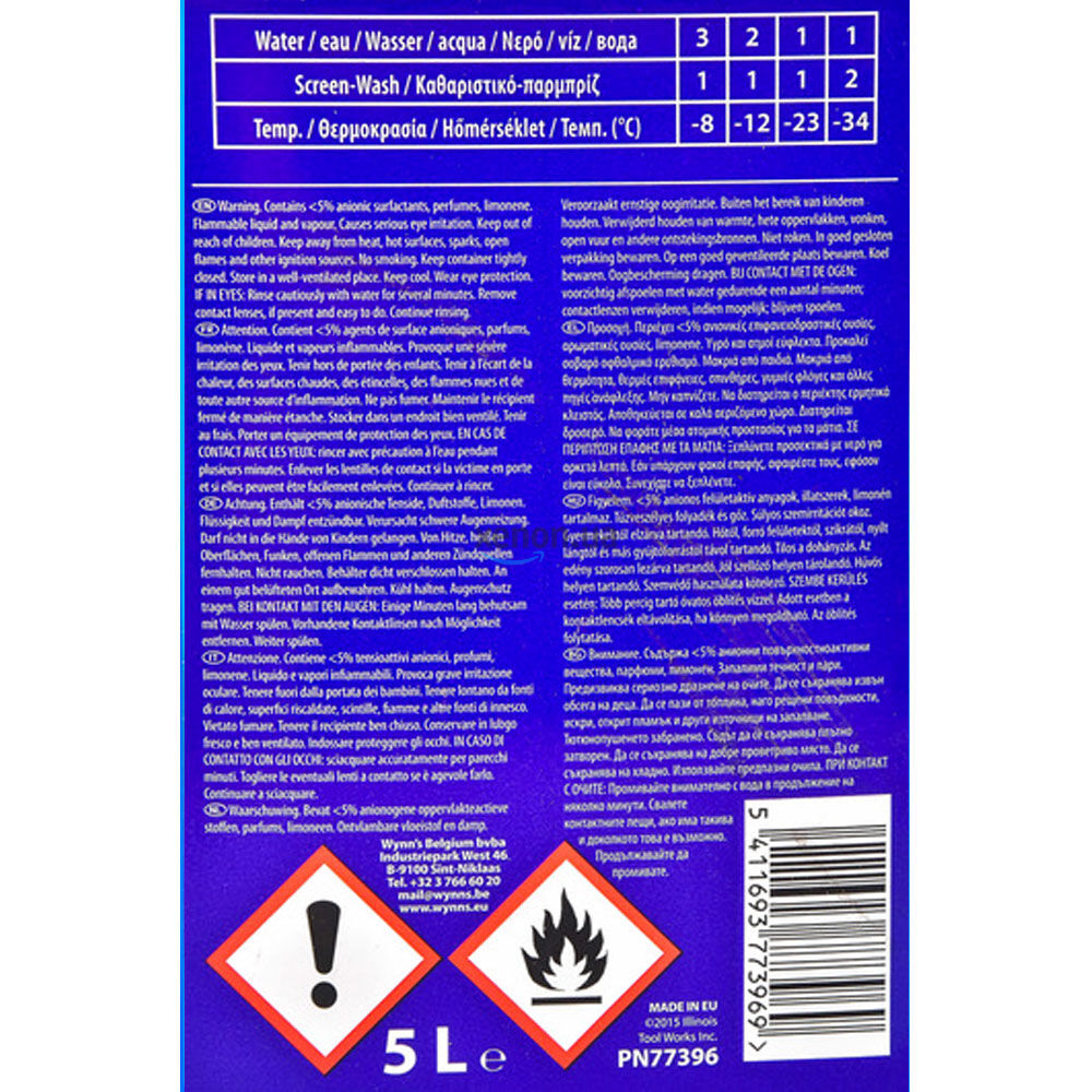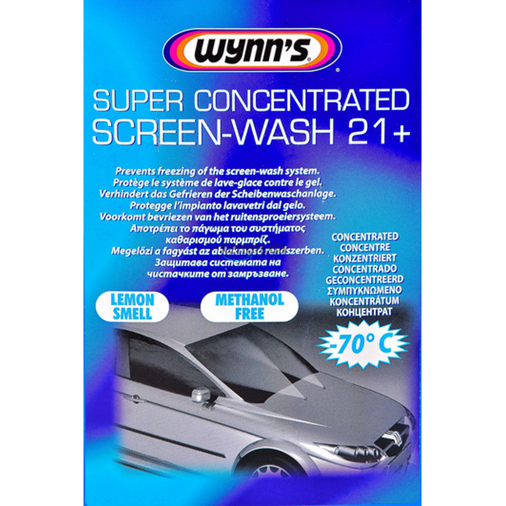Суперконцентрированный Wynn's Screen-Wash 21+ – это высококонцентрированный очищающий и антифризный продукт для стеклоочистителей. Защищает систему очистки стекла от замерзания до температуры -58°С. Соответствует новым нормам ЕС по складированию и безопасности. Приятный лимонный запах (не вызывает раздражения, изопропанольного запаха). Соответствует ASTM D1882 (не наносит вреда краске автомобиля). Вы получаете до 30 литров омывателя -10 ° С в пятилитровой банке. Зимний концентрат омывателя WYNN`S произведенный в Бельгии выдерживает температуру до -58°С, готов к применению как без смешивания, так и вместе с дистиллированной водой. Технология антизамерзания.